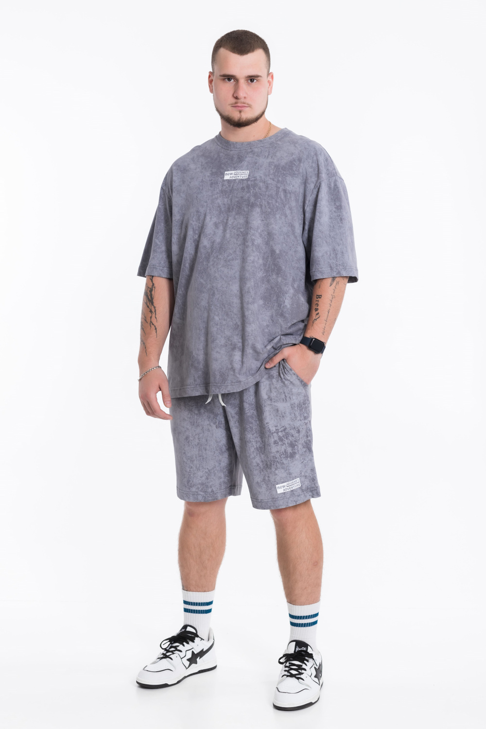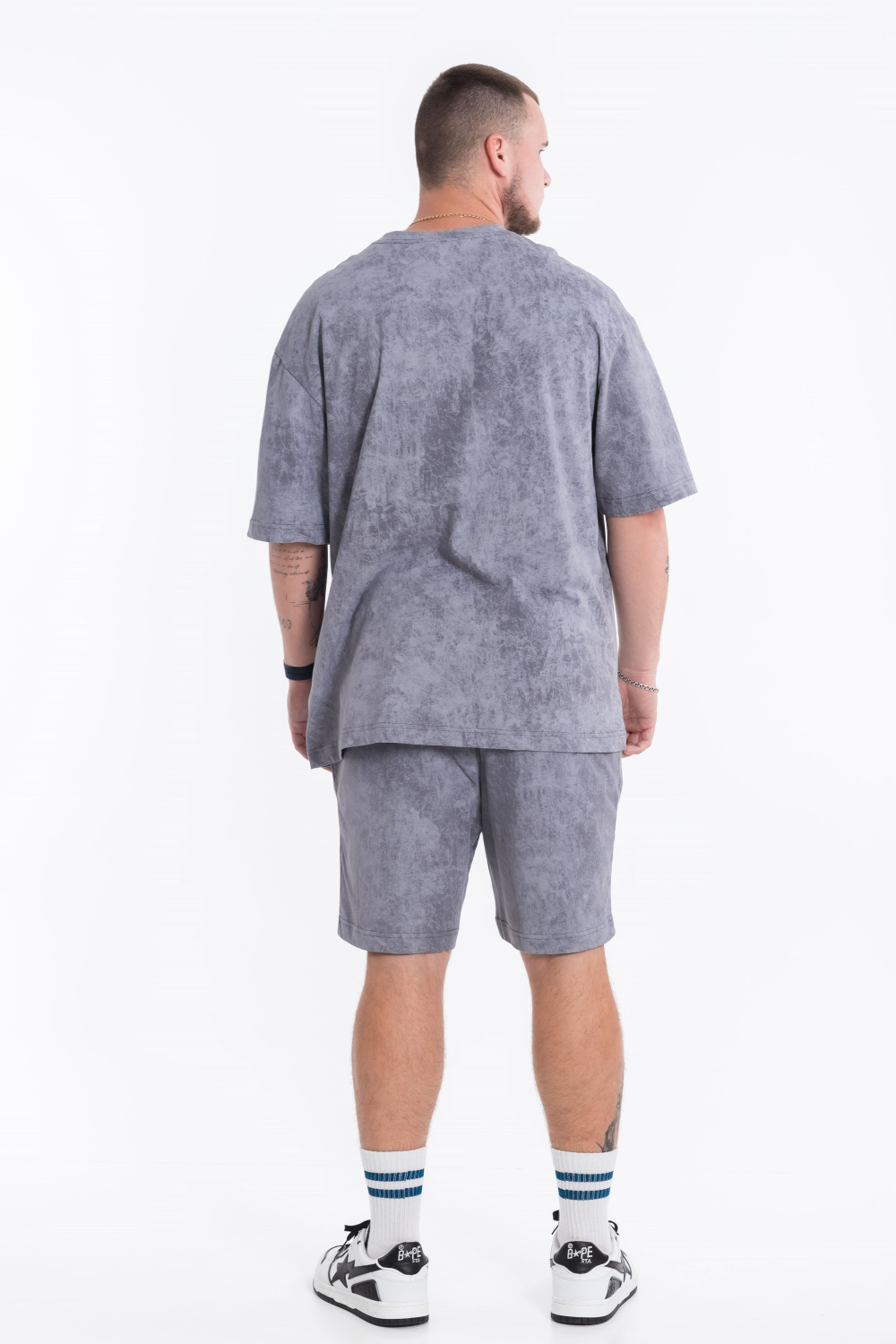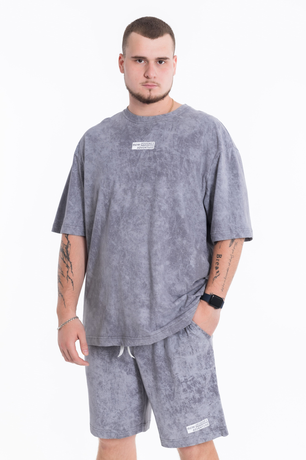 Мужской костюм — отличный выбор для повседневной носки. Он состоит из футболки и шорт, выполненных из качественного хлопкового полотна однотонного серого цвета, что обеспечивает комфорт и удобство в носке.