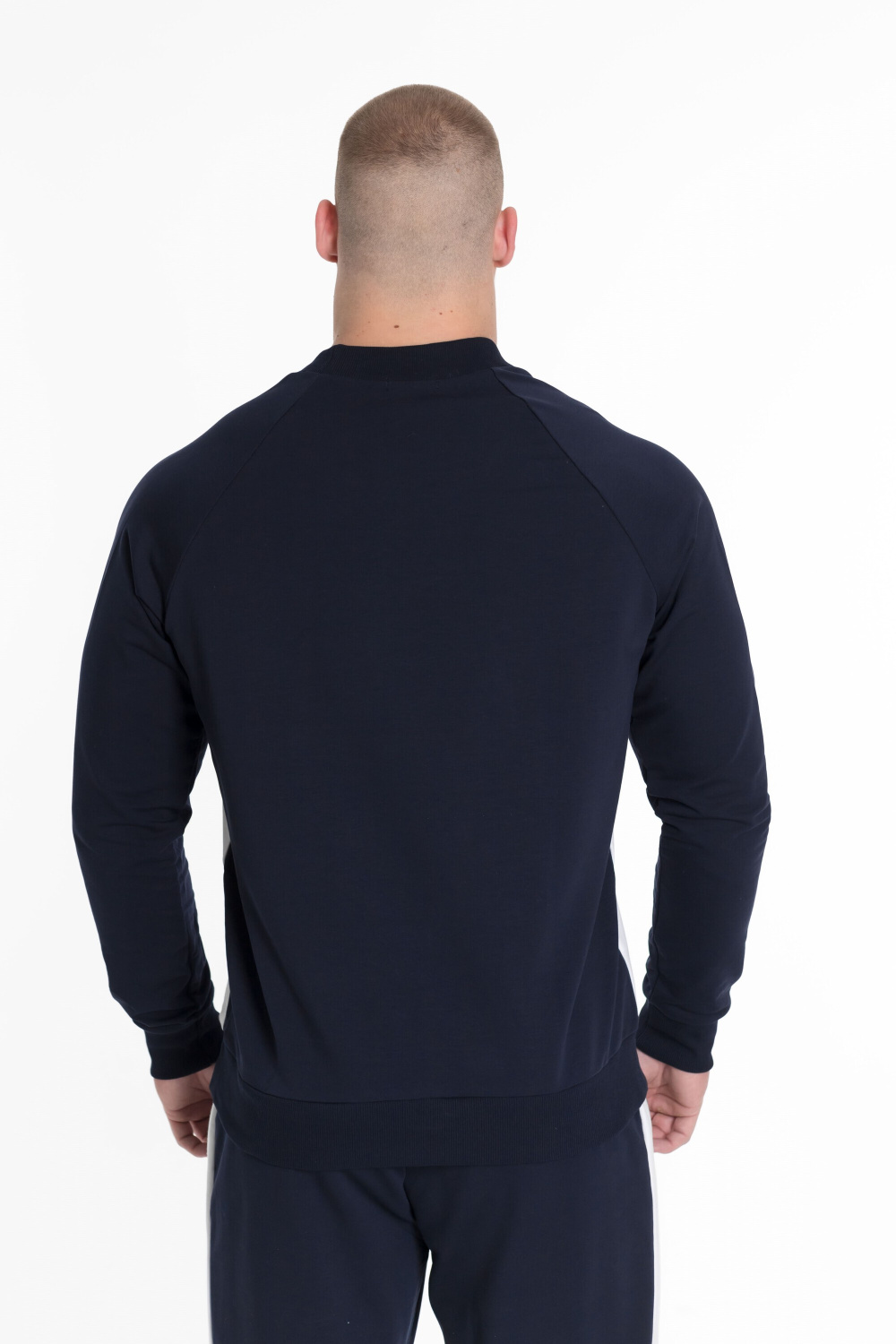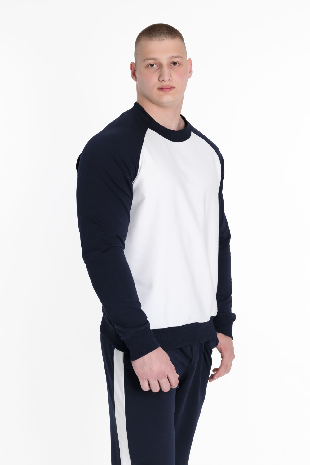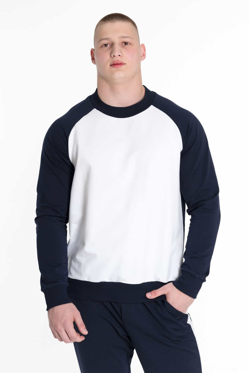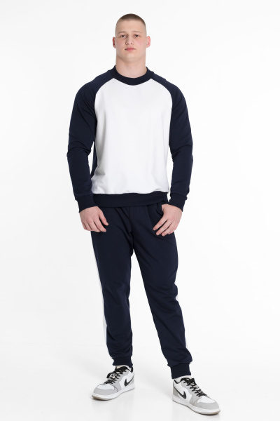 Толстовка имеет рукав-реглан синего цвета, спинка также синего цвета, а перед белого цвета. Круглый вырез горловины дополняется манжетами и поясом из кашкорсе синего цвета. Этот дизайн делает толстовку оригинальной.