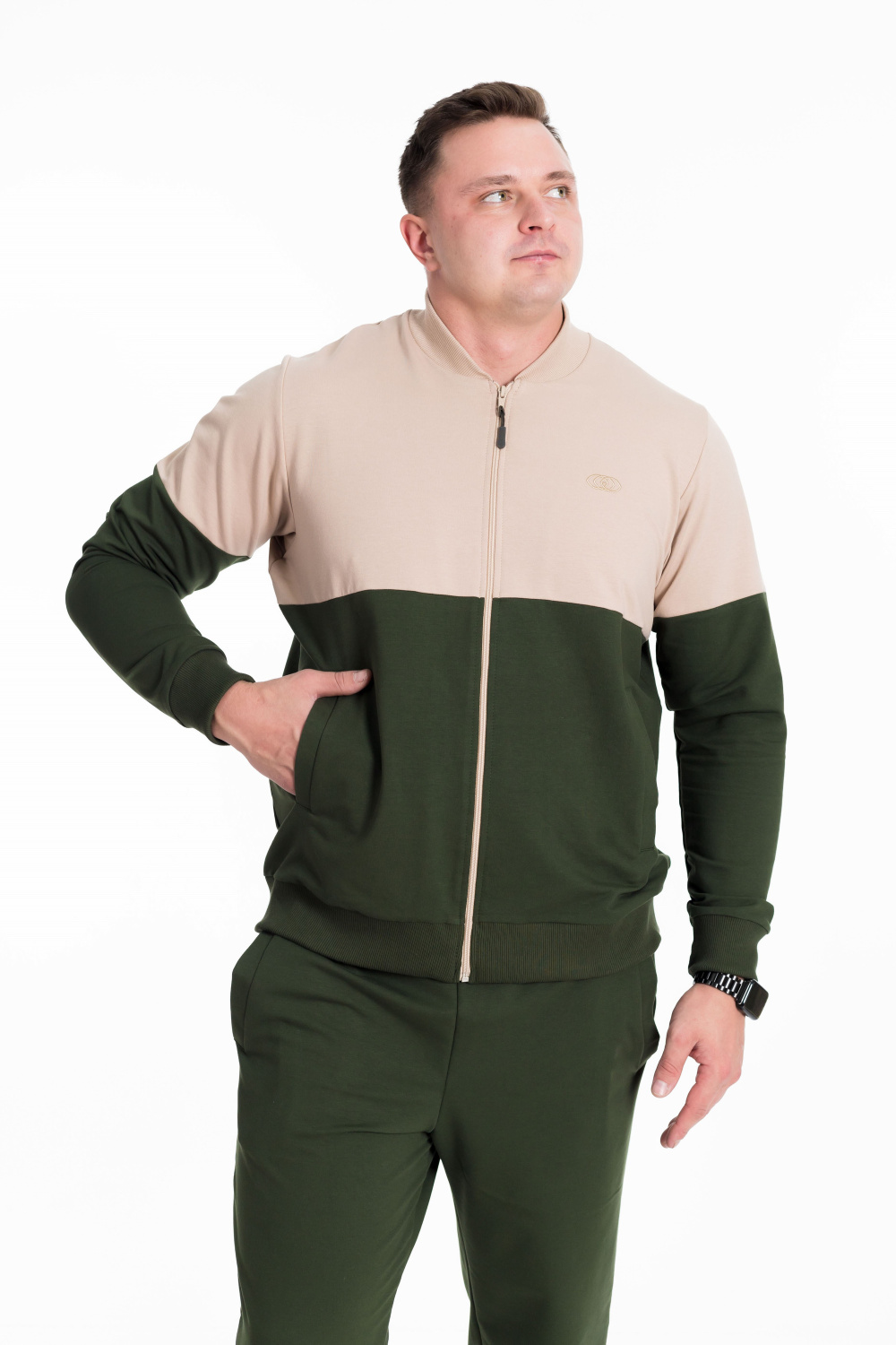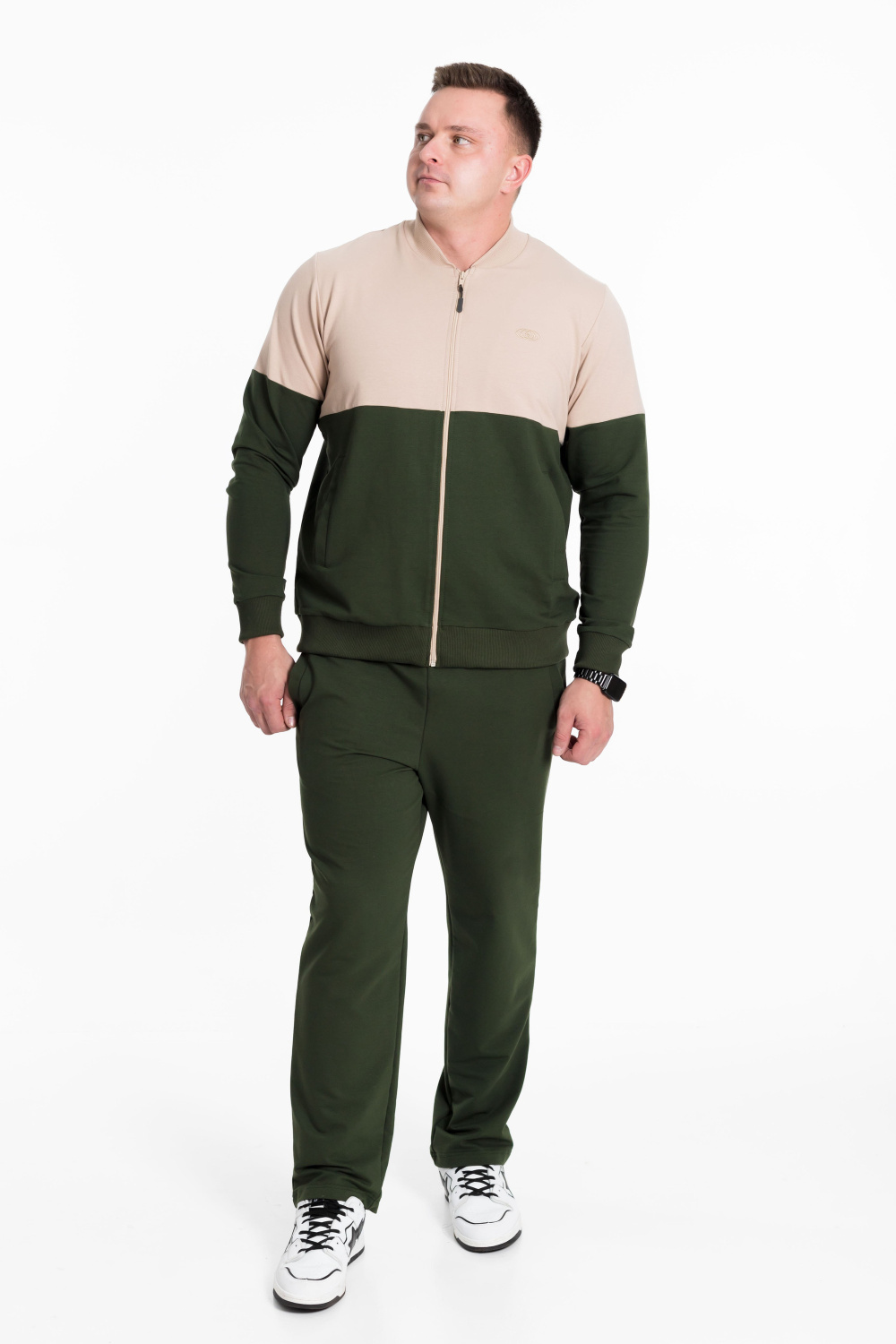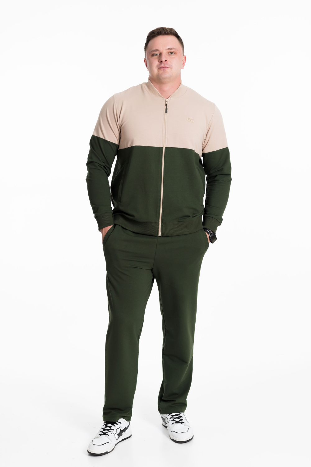 Костюм выполнен из футер петли с лайкрой. Толстовка с воротником-стойкой, застёжкой на молнию и длинным рукавом. По бокам прорезные карманы. С левой стороны толстовку украшает вышивка. Брюки прямые, с поясом на резине и карманами по бокам.