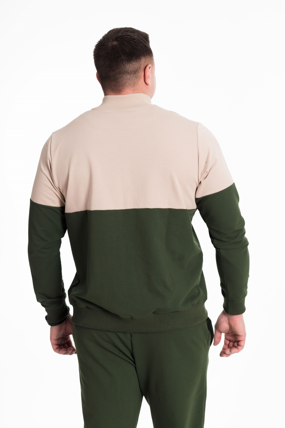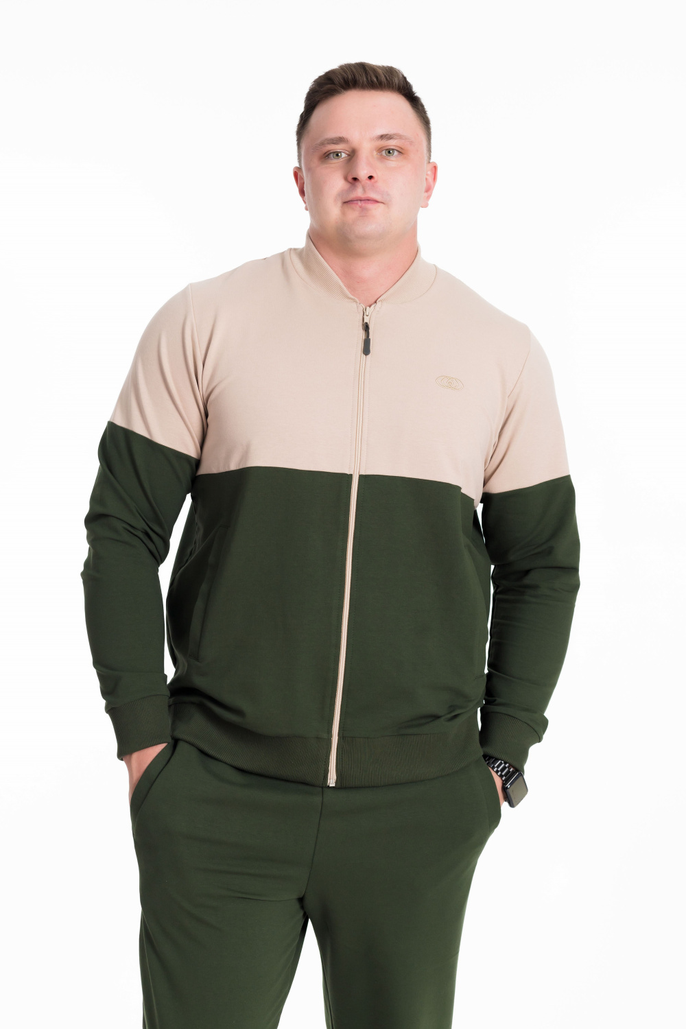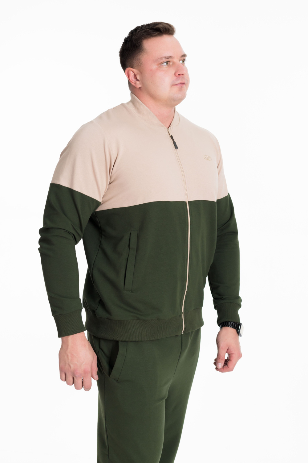 Костюм выполнен из футер петли с лайкрой. Толстовка с воротником-стойкой, застёжкой на молнию и длинным рукавом. По бокам прорезные карманы. С левой стороны толстовку украшает вышивка. Брюки прямые, с поясом на резине и карманами по бокам.