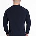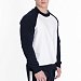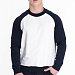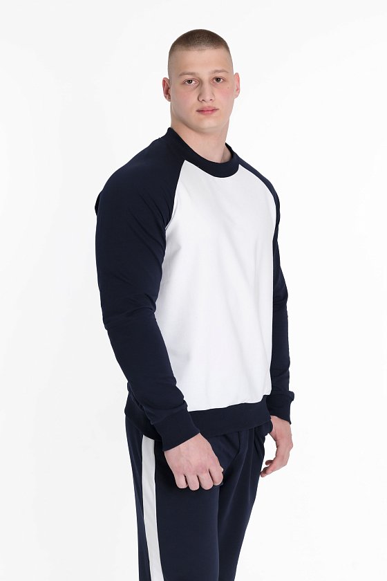 Толстовка имеет рукав-реглан синего цвета, спинка также синего цвета, а перед белого цвета. Круглый вырез горловины дополняется манжетами и поясом из кашкорсе синего цвета. Этот дизайн делает толстовку оригинальной.