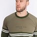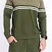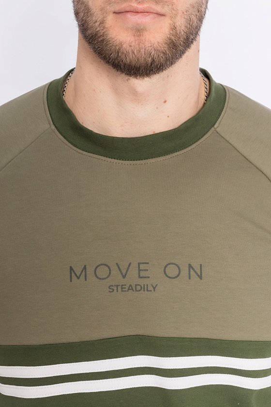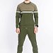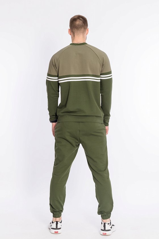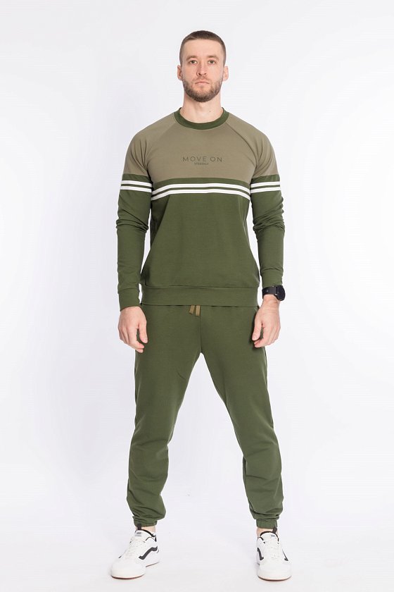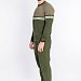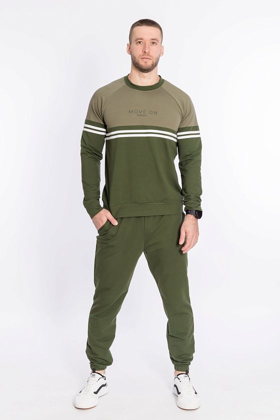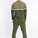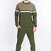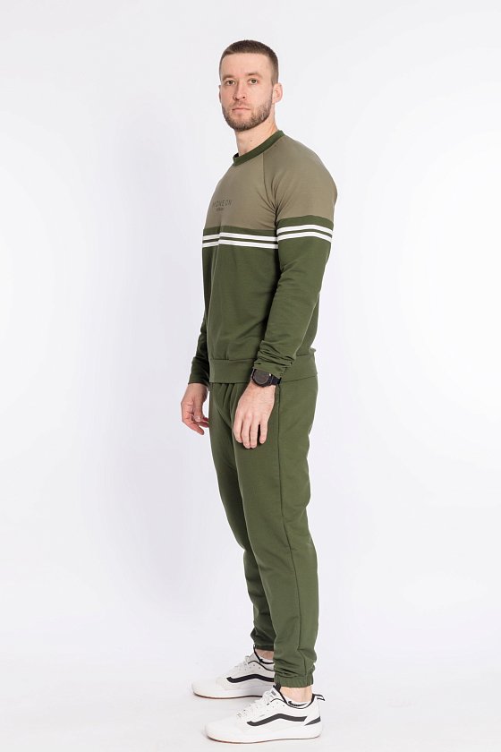 Костюм выполнен из однотонного футера с лайкрой. Костюм состоит из брюк и толстовки. Толстовка с рукавом реглан, притачным поясом и манжетами. На толстовке в качестве отделки лампасы и принт. Брюки с притачным поясом на резине и шнуре. Низ брюк собран на резинку, по бокам размещены карманы.
