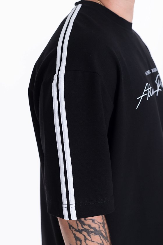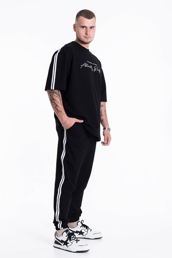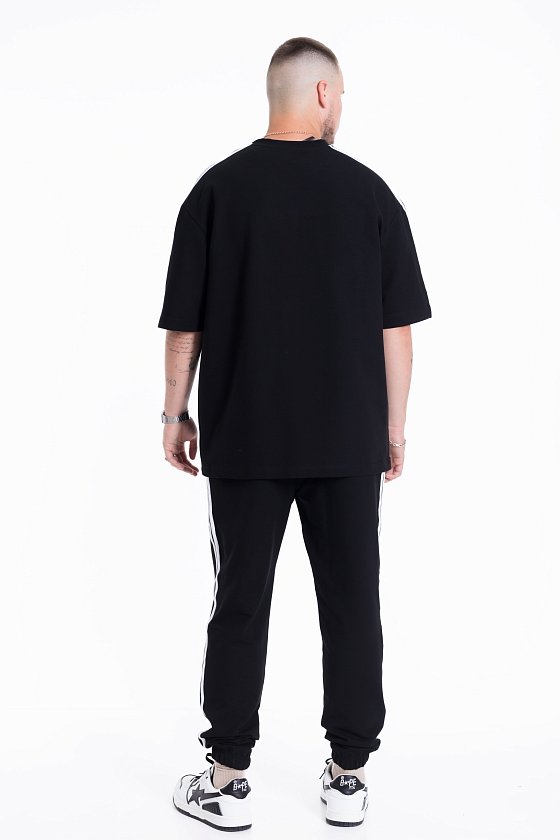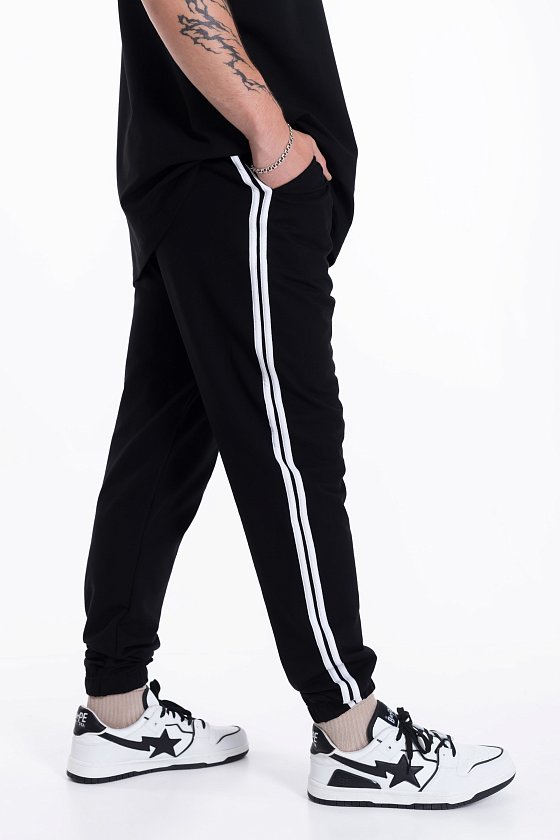 По боковым швам брюк, плечевой части полочки и рукаву проложены лампасы.