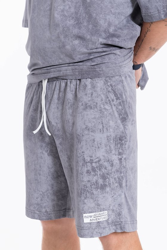 Футболка имеет спущенную линию плеча и короткие рукава, а также интересный принт спереди. Шорты оснащены карманами по бокам и поясом на широкой резинке со шнуром. Кроме того, принт на штанинах шорт соответствует принту на футболке, создавая стильный и гармоничный образ.