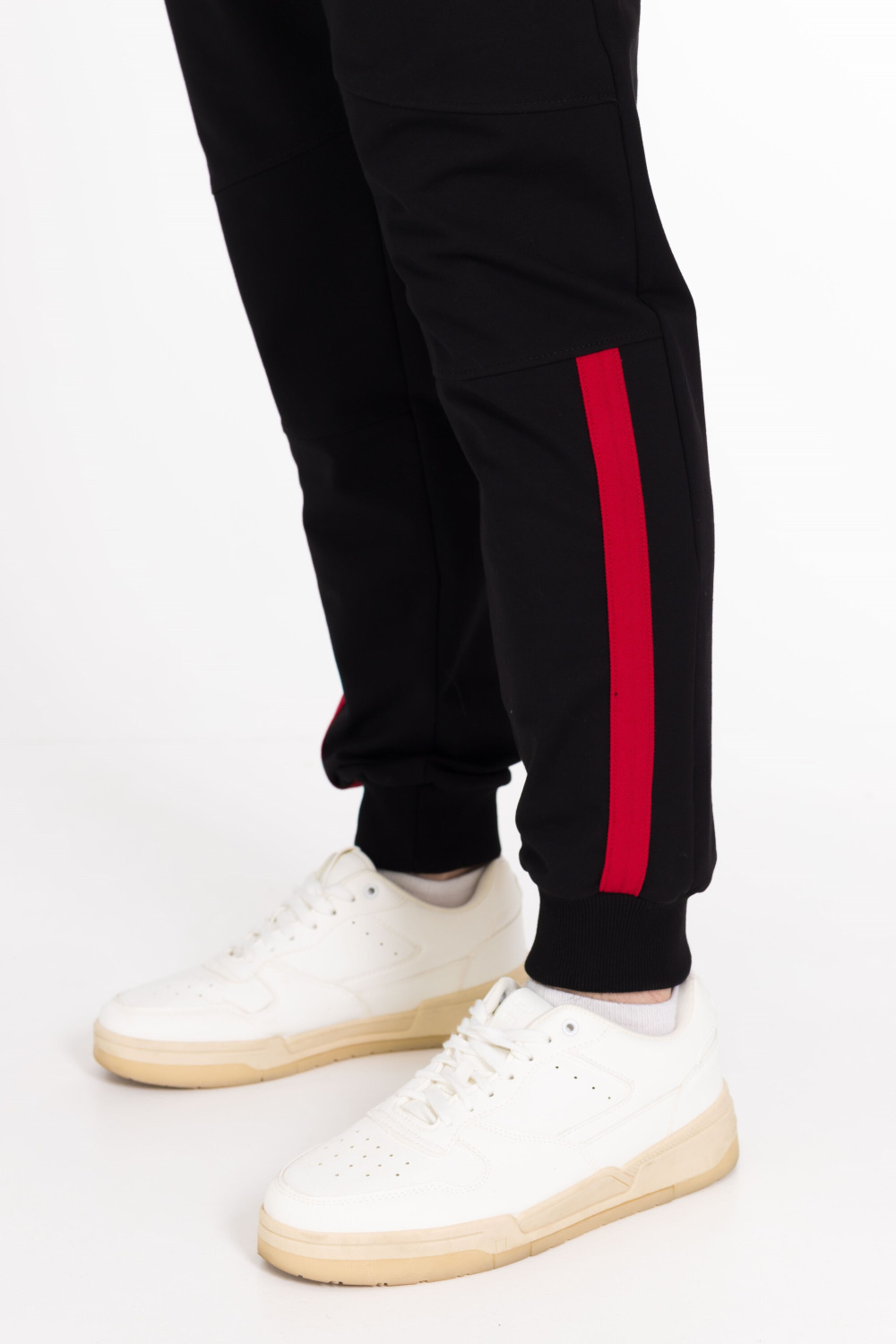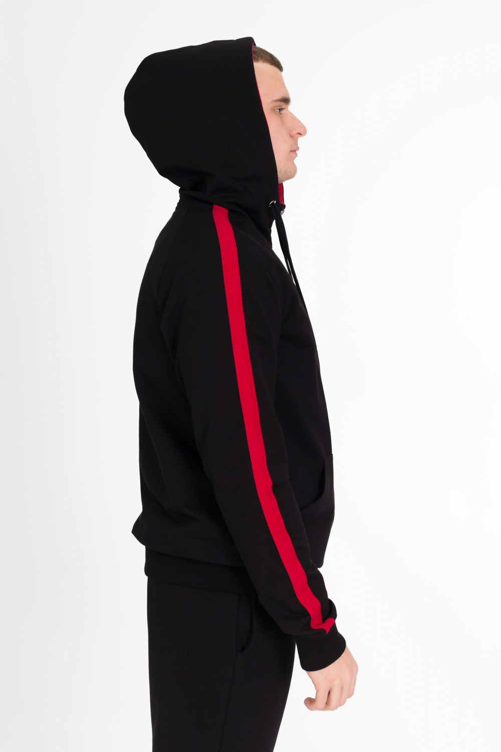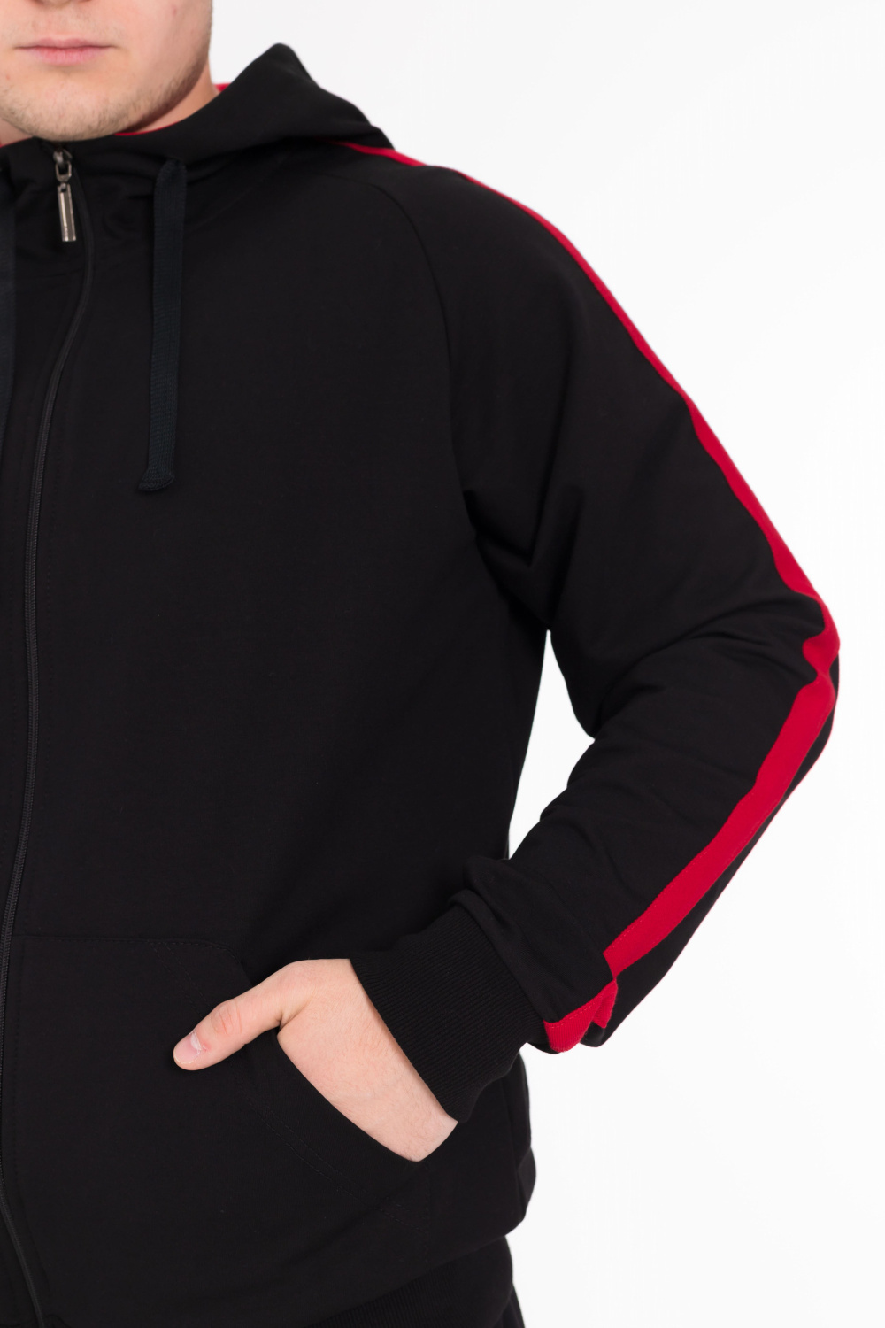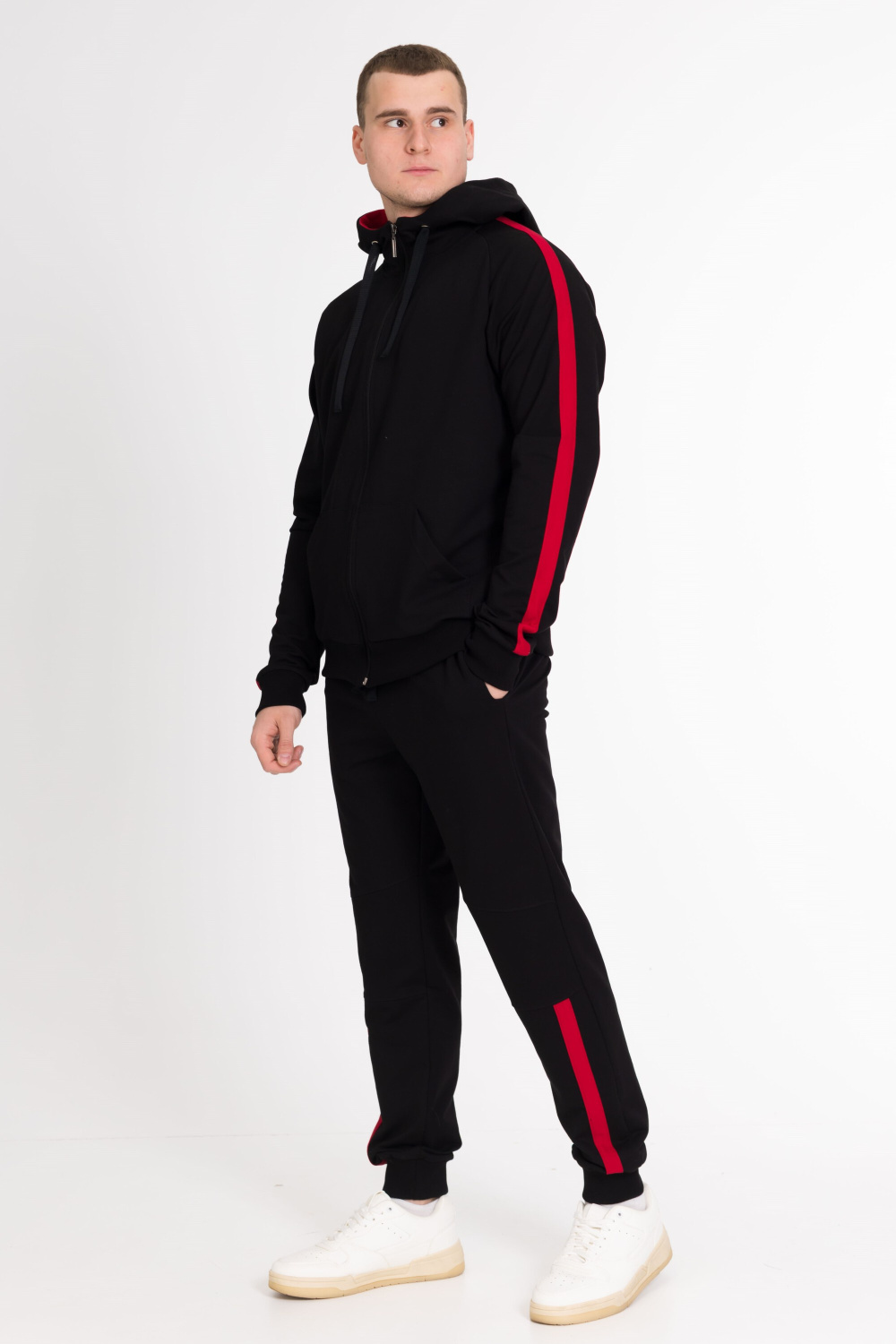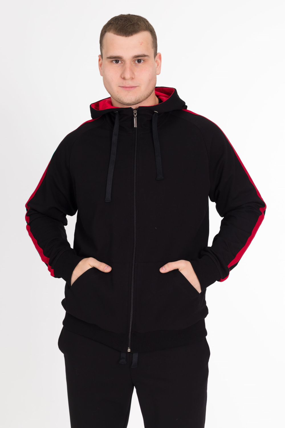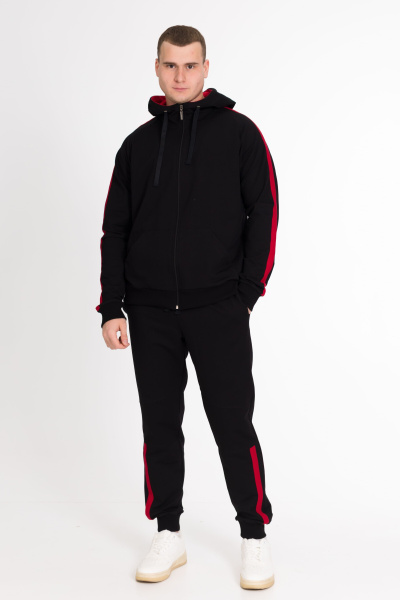 Мужской спортивный костюм из футер петли, куртка с карманами, длинным рукавом, капюшоном, застёжкой на молнию. Брюки с карманами по бокам, пояс на резинке и шнуре, внизу на манжетах. На куртке и штанах вставки из полотна контрастного цвета.