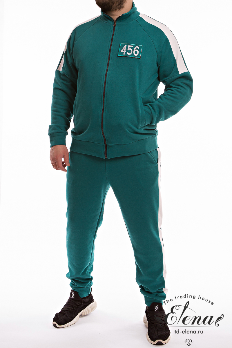 Костюм из однотонной футер петли трёхнитки ("воздушка") с отделочными полосами на брюках и верхних частях рукавов. Брюки с притачным поясом и манжетами внизу. В поясе через люверсы проложен шнур. Толстовка с воротником, рукавами реглан, с притачным поясом и манжетами. Спереди застёжка на молнию, с левой стороны съёмная нашивка. Толстовка и брюки с карманами по бокам.