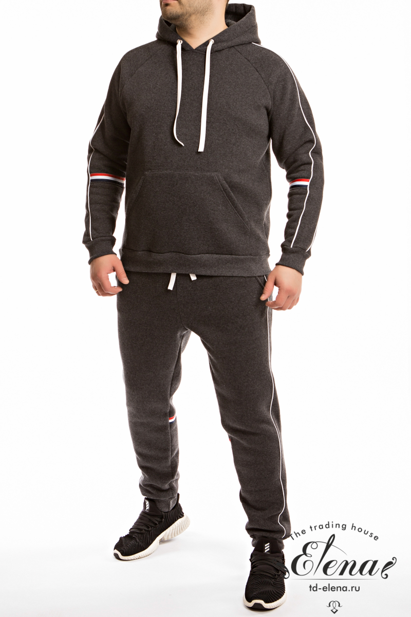 Костюм из однотонного футера с начёсом. Костюм состоит из брюк и толстовки. Толстовка с рукавом реглан, капюшоном, притачным поясом и манжетами. Спереди карман-кенгуру. Брюки с притачным поясом и манжетами по низу, по бокам размещены карманы. На толстовке и брюках вставки с кантом и декоративной тесьмой.