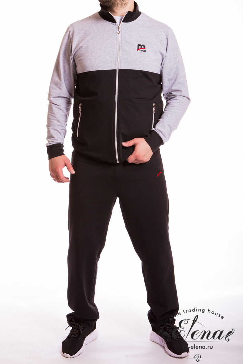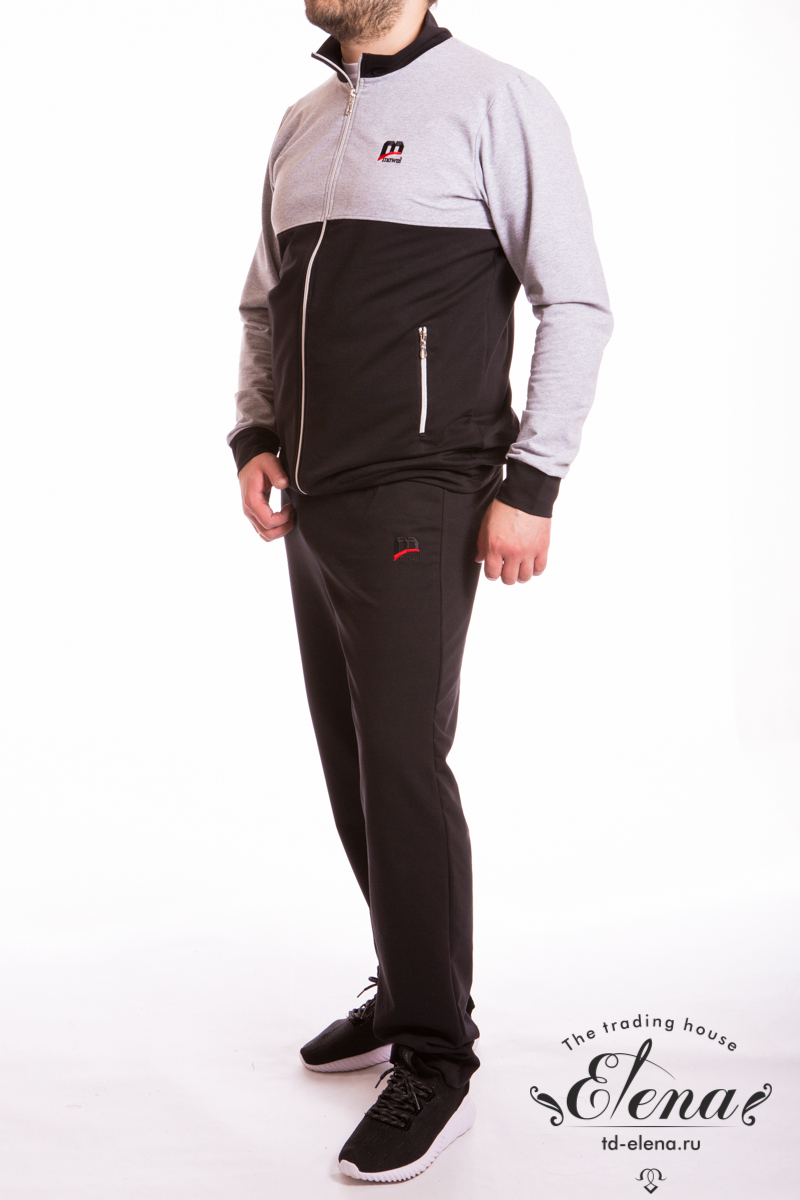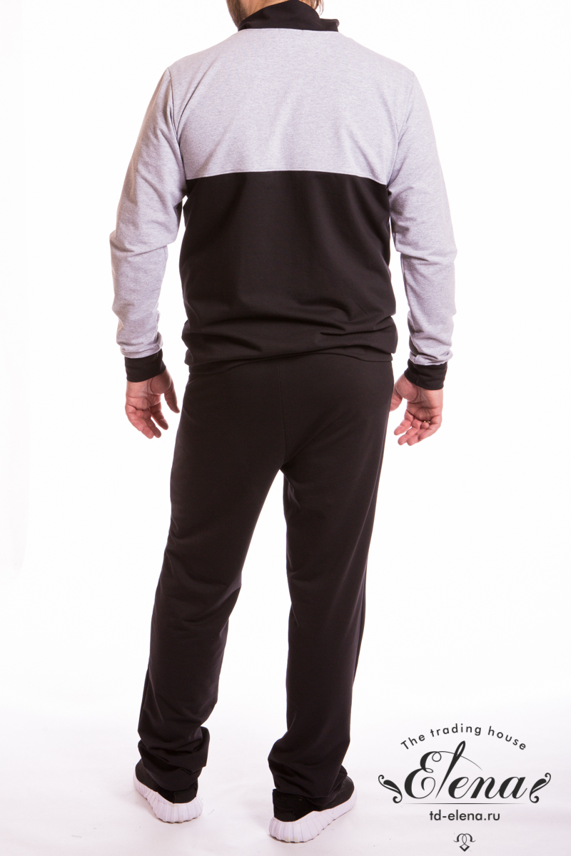 Мужской костюм выполнен из футер петли с лайкрой. Куртка с центральной застёжкой на молнию, воротником-стойкой, внизу пояс, рукава с манжетами. По бокам размещены карманы на молнии, спереди вышивка. Брюки с поясом на резинке и вышивкой с левой стороны.