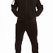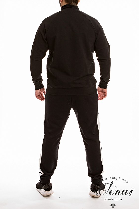 Костюм из однотонной футер петли трёхнитки воздушка с отделочными полосами на брюках и верхних частях рукавов. Брюки с притачным поясом и манжетами внизу. В поясе через люверсы проложен шнур. Толстовка с воротником, рукавами реглан, с притачным поясом и манжетами. Спереди застёжка на молнию, с левой стороны вышивка. Толстовка и брюки с карманами по бокам.