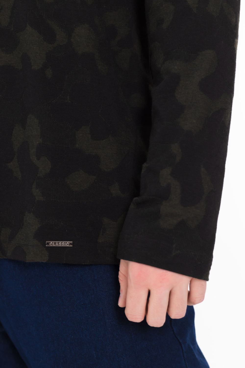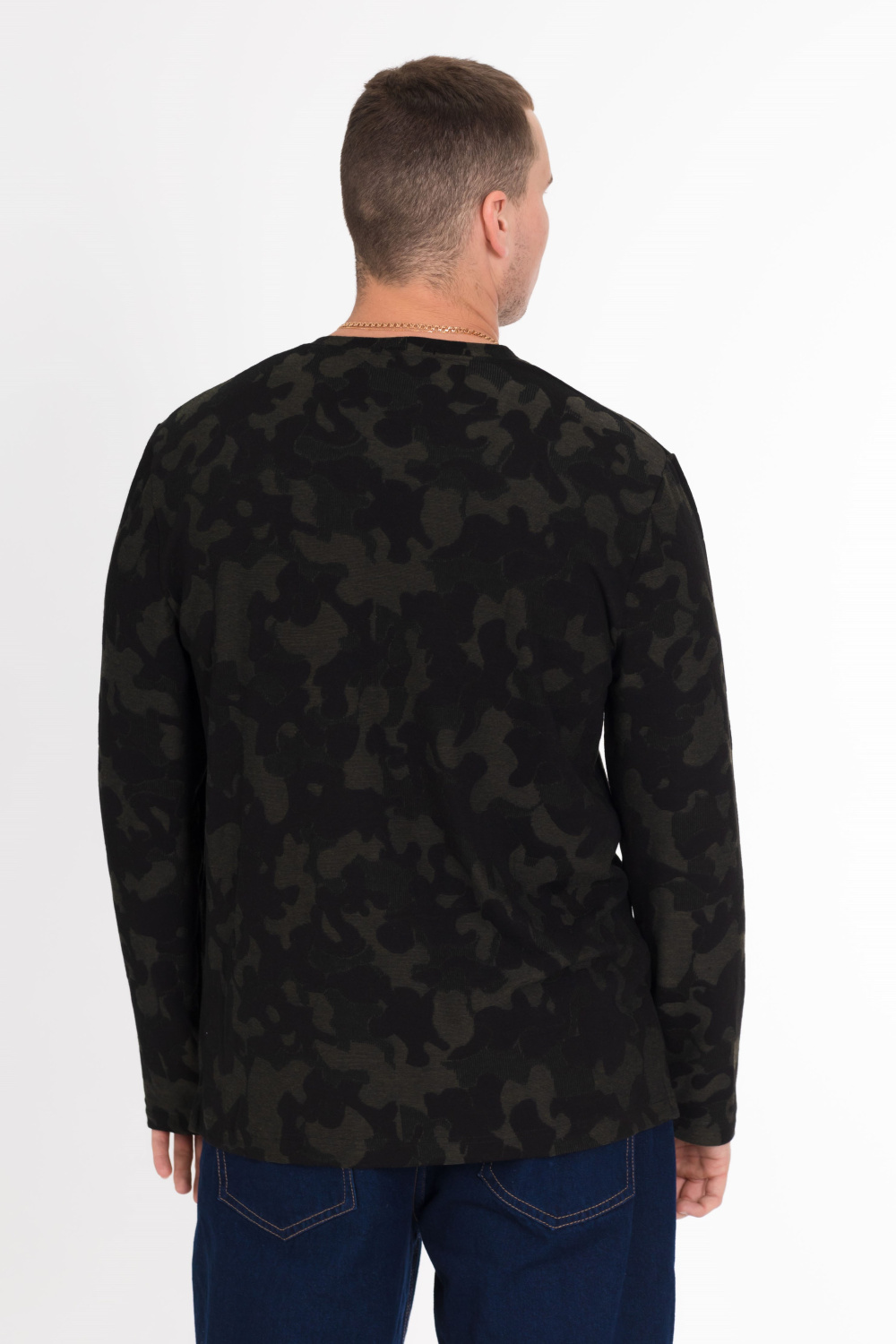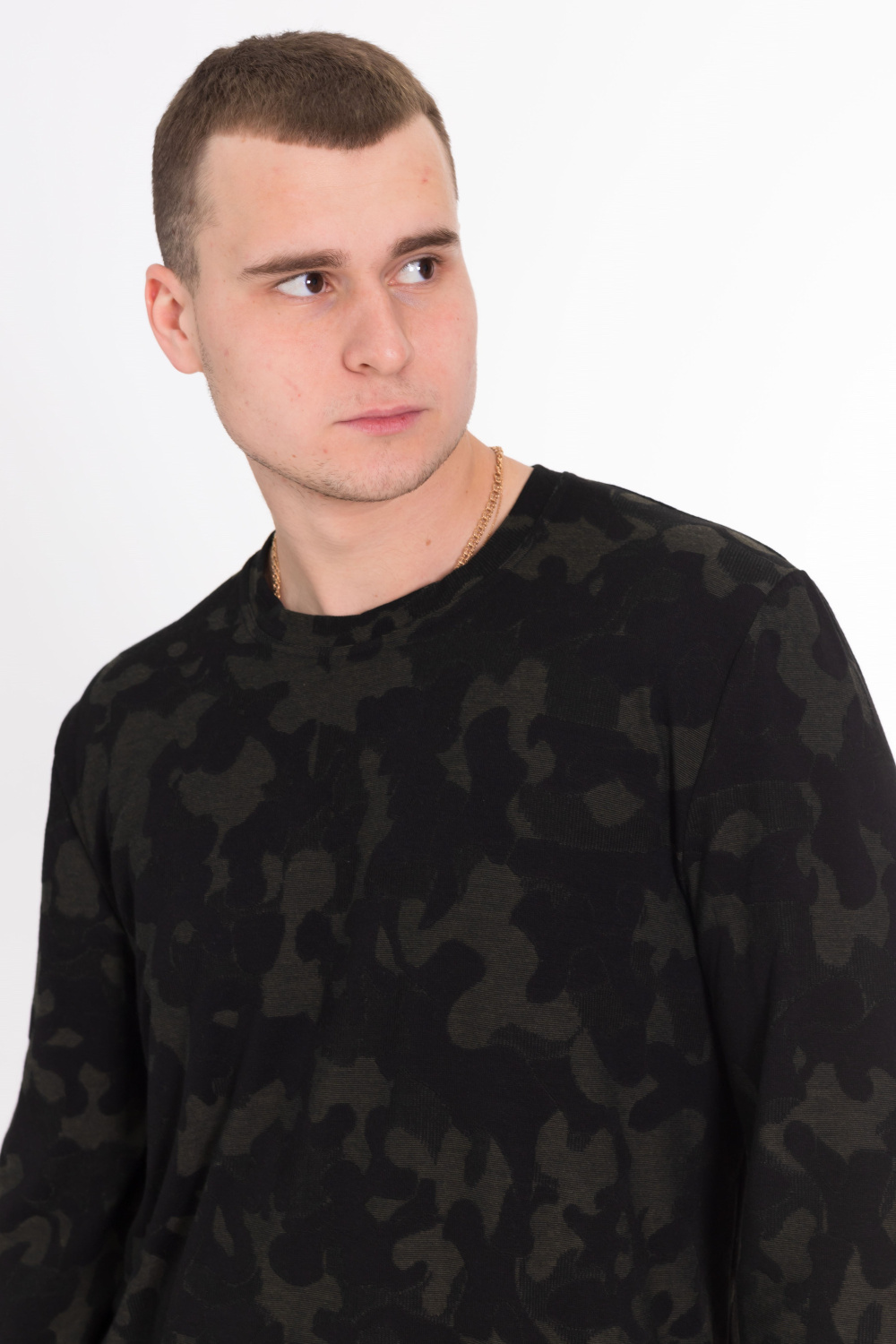Футболка с длинным рукавом выполнена из интерлока камуфляжной расцветки.