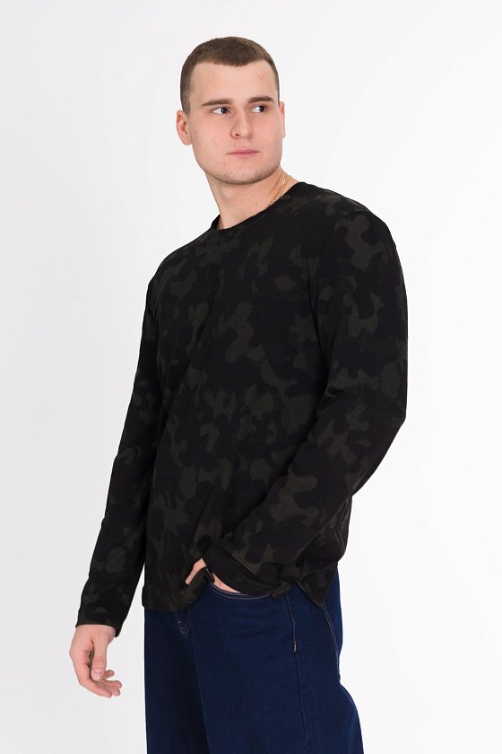Футболка с длинным рукавом выполнена из интерлока камуфляжной расцветки.