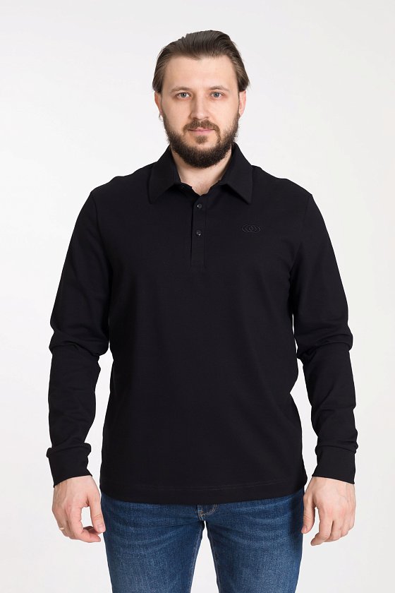 Лонгслив-поло из однотонного пике с втачным рукавом на притачной манжете. Воротник на отрезной стойке. Застежка на полочке на пуговицы. С левой стороны полочки вышивка фирменного логотипа в цвет поло.