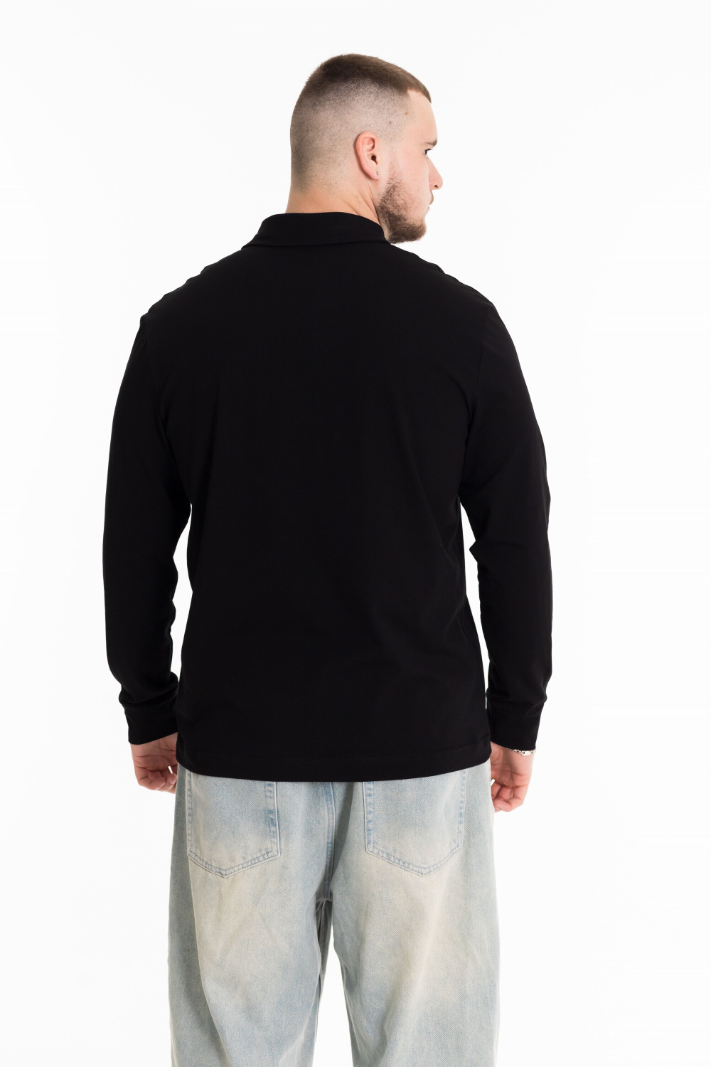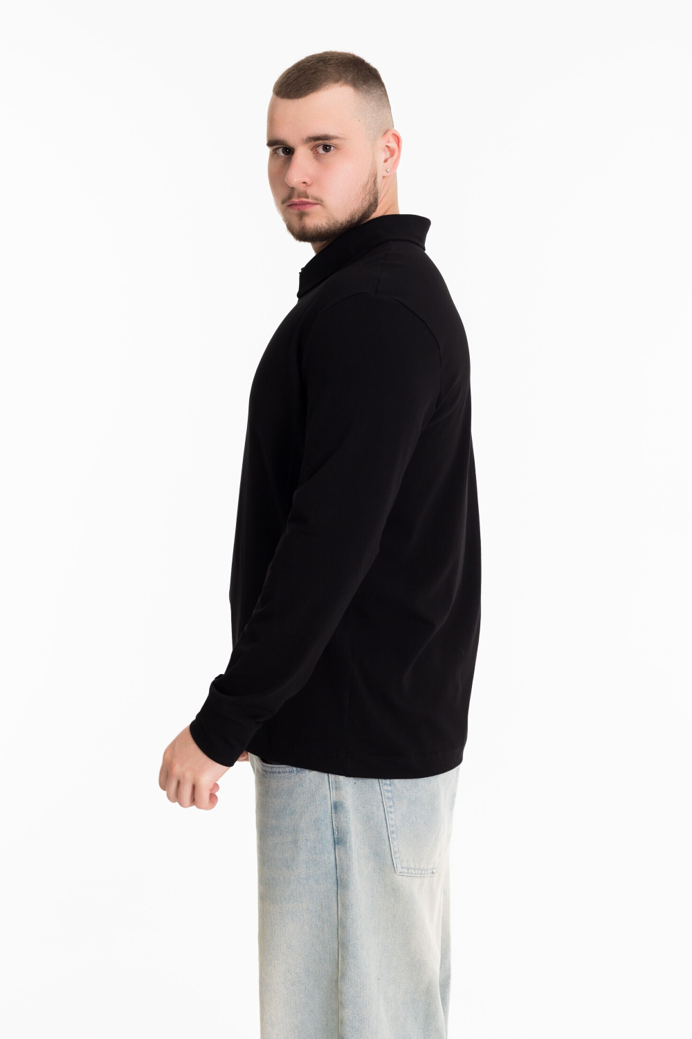 Лонгслив-поло из однотонного хлопкового полотна с добавлением лайкры. Втачной рукав на манжете, воротник на отрезной стойке с застежкой на три пуговицы.