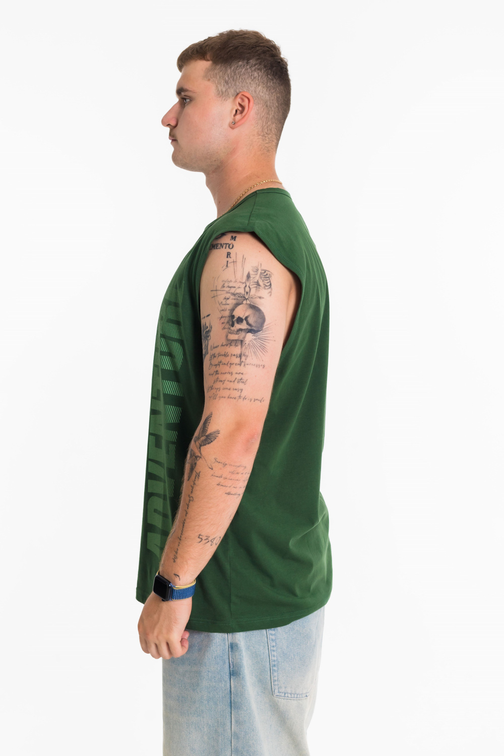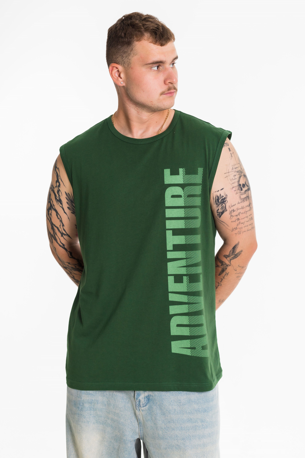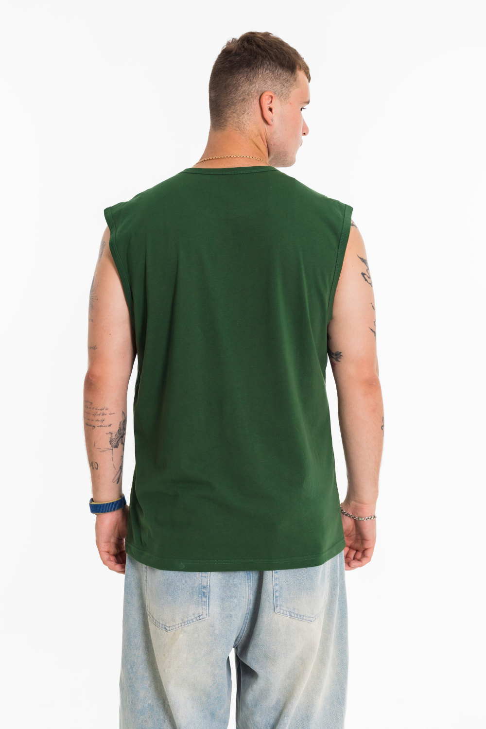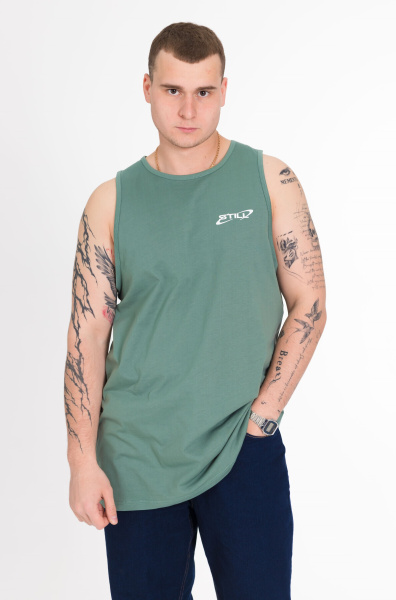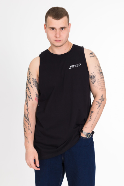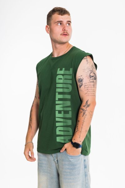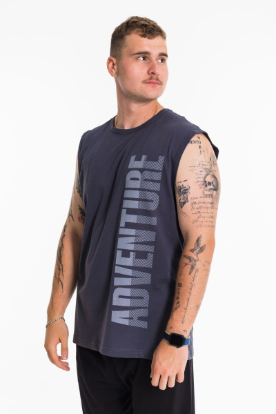 Майка с широким плечом выполнена из однотонной кулирки, 100% хлопок. Круглая горловина и проймы обработаны широкой бейкой. Спереди расположен принт.