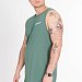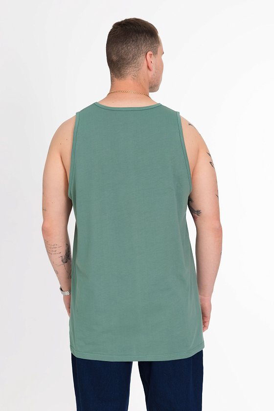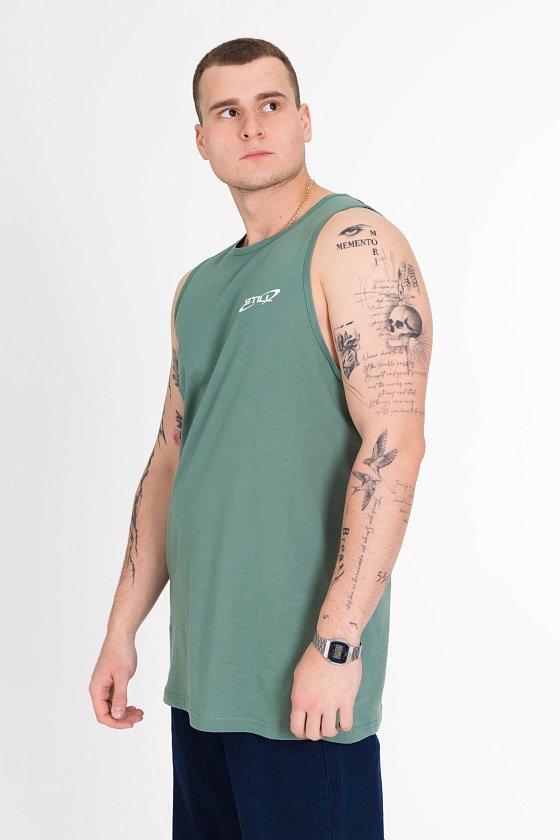Майка выполнена из однотонной кулирки. Майка с углубленной проймой, спереди нанесён принт.
