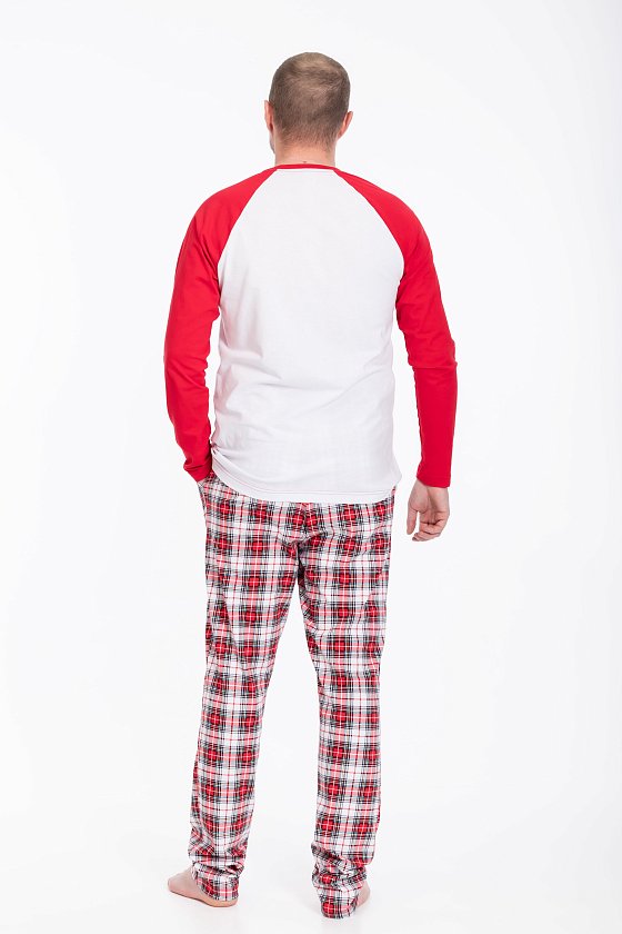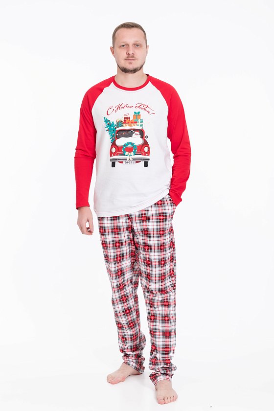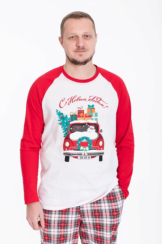 Мужская пижама новогодняя - лонгслив и брюки, изготовлена из мягкого и приятного к телу хлопкового полотна. Лонгслив прямого кроя, рукава реглан, перед и спинка белого цвета, спереди нанесён принт. Круглый вырез горловины отделан бейкой красного цвета. Брюки прямого кроя из кулирки с набивным рисунком в клетку, пояс на резинке. Изготовленная из натуральной ткани, пижама обеспечит комфорт в течение всего дня.