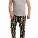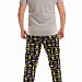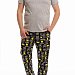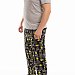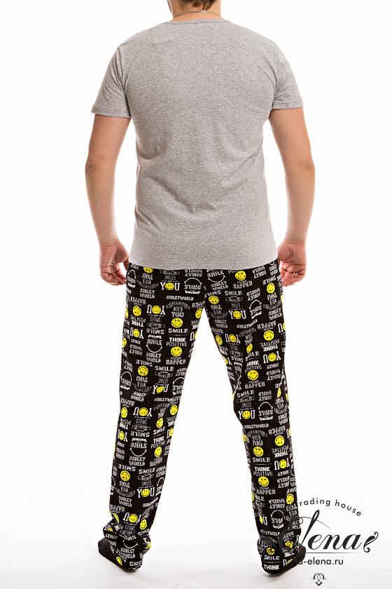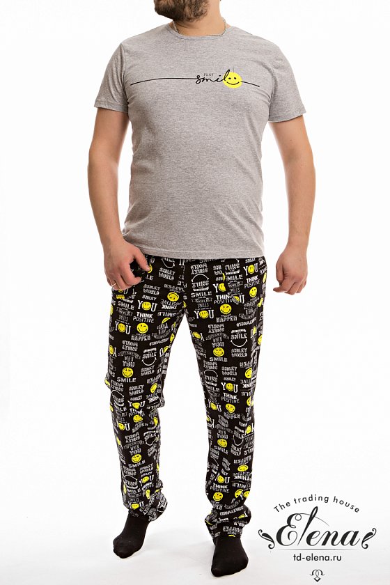 Мужская пижама выполнена из хлопкового полотна, состоит из брюк и футболки. Брюки с поясом на резинке, по бокам расположены карманы. Футболка однотонная, с коротким рукавом и круглым вырезом горловины, оформленным бейкой. Спереди нанесён принт.