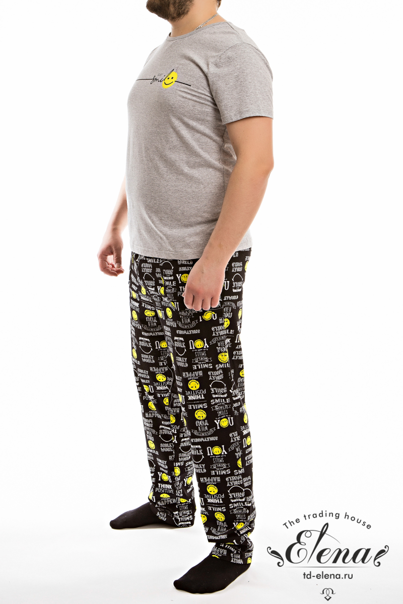 Мужская пижама выполнена из хлопкового полотна, состоит из брюк и футболки. Брюки с поясом на резинке, по бокам расположены карманы. Футболка однотонная, с коротким рукавом и круглым вырезом горловины, оформленным бейкой. Спереди нанесён принт.