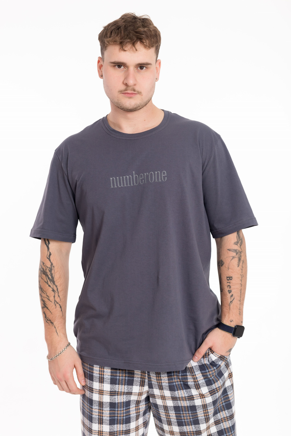 Мужская пижама из хлопкового полотна - практичный и удобный комплект для сна и домашнего отдыха. Футболка прямого кроя с втачным рукавом обеспечивает комфортную посадку и свободу движений. Спереди расположен стильный принт, который добавляет образу выразительности. Брюки прямого силуэта, с поясом на мягкой резинке и удобными карманами в боковых швах — всё для комфорта в повседневной носке.
