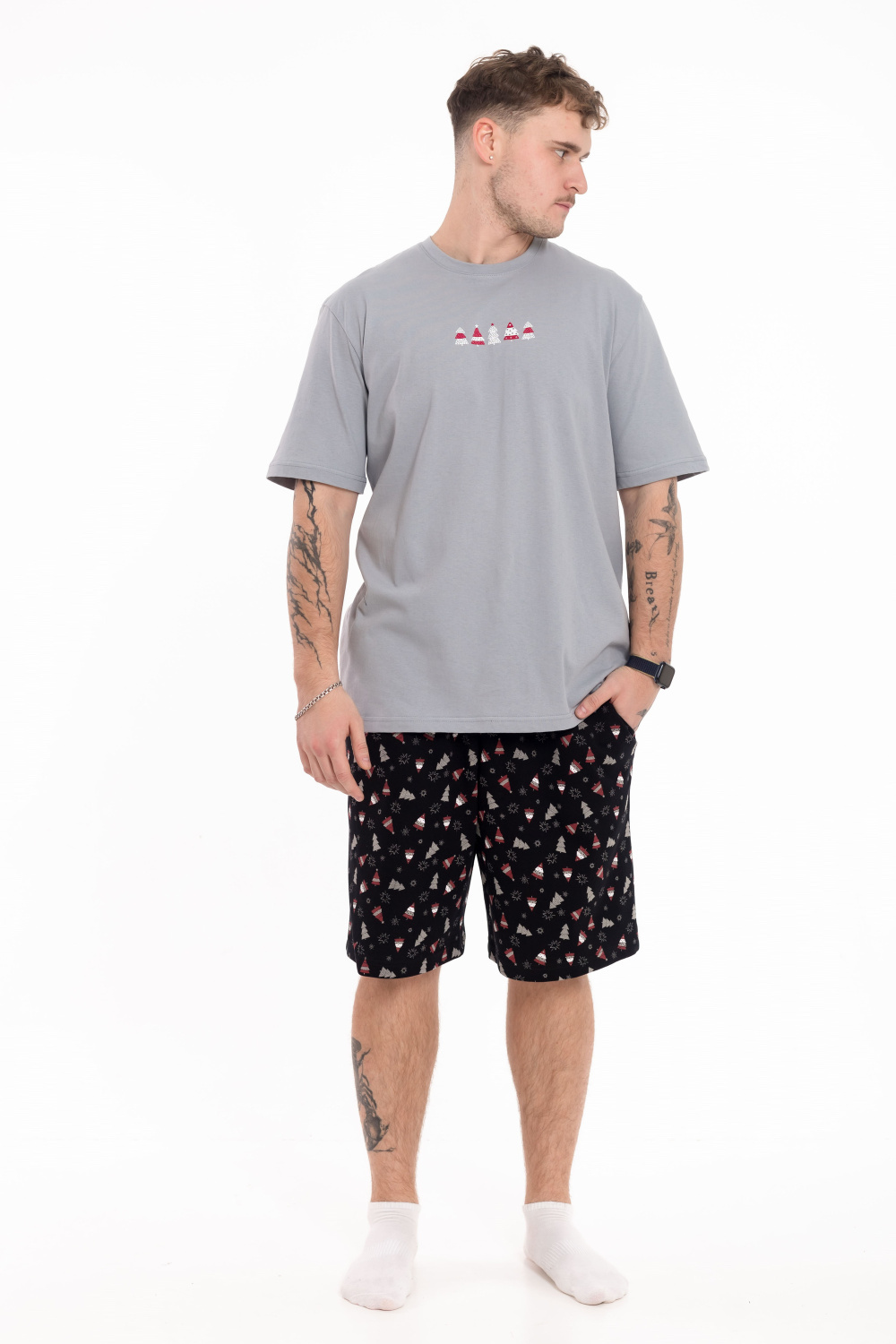 Мужская пижама, состоящая из футболки и шорт — практичный комплект для сна и отдыха дома. Футболка из хлопкового полотна с прямым кроем, втачным рукавом и круглым вырезом горловины обеспечивает комфортную посадку. Спереди расположен стильный принт, который добавляет образу выразительности. Шорты из мягкого интерлока с поясом на резинке и карманами в боковых швах — всё для удобства в повседневной носке.