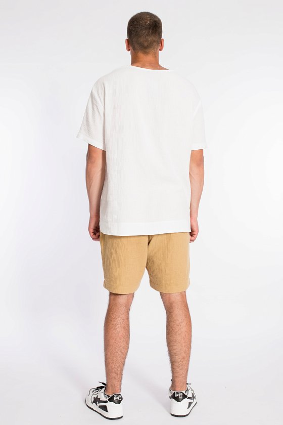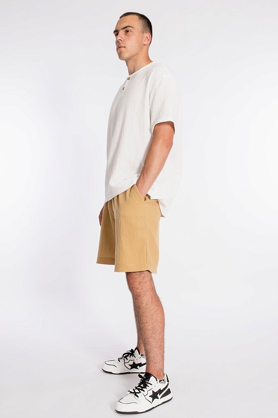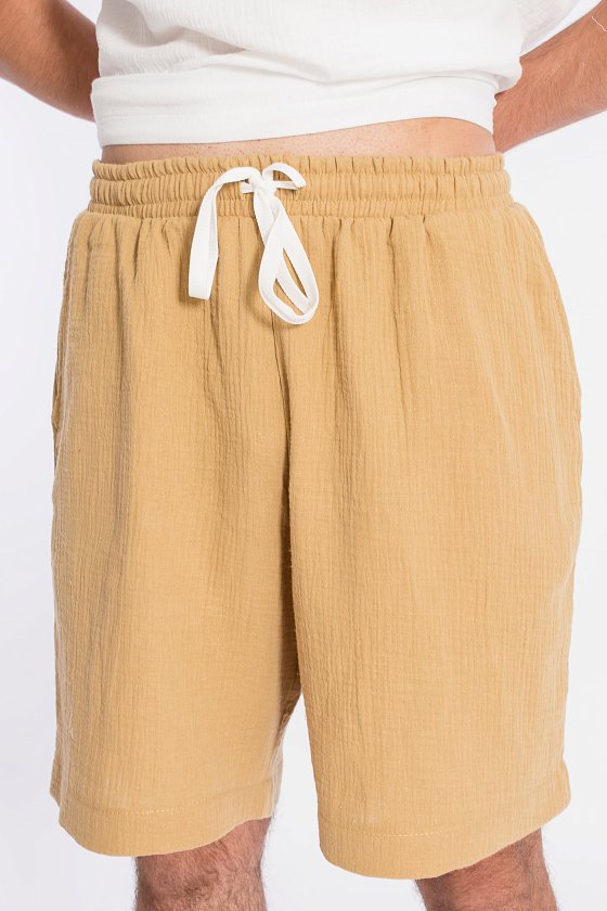 Шорты мужские выполнены из муслина. С боковыми карманами и притачным поясом на резине и шнуре.