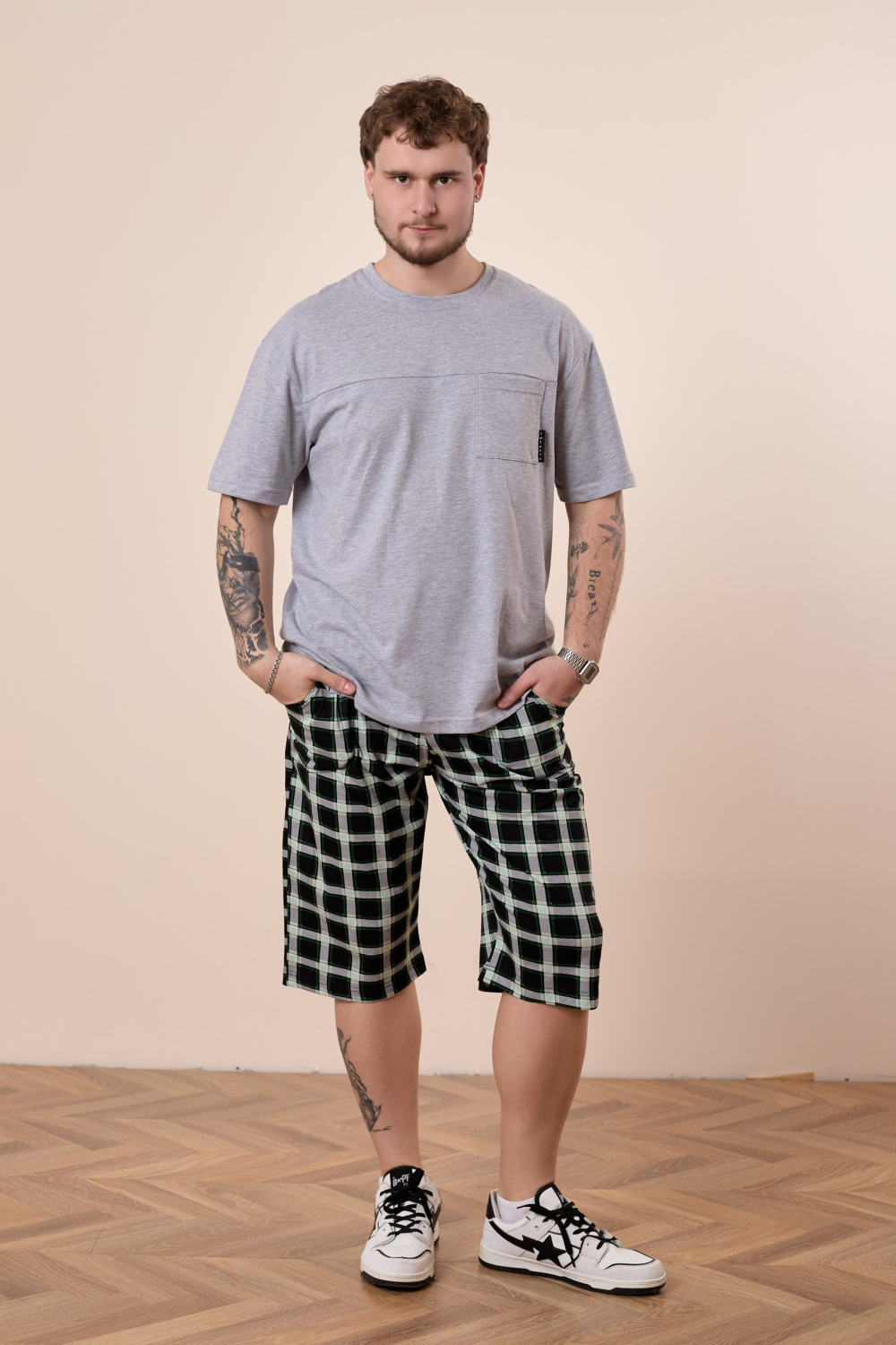 Капри мужские выполнены из хлопкового полотна с набивным рисунком. Прямого свободного кроя, с двумя карманами по бокам. Пояс на резинке.