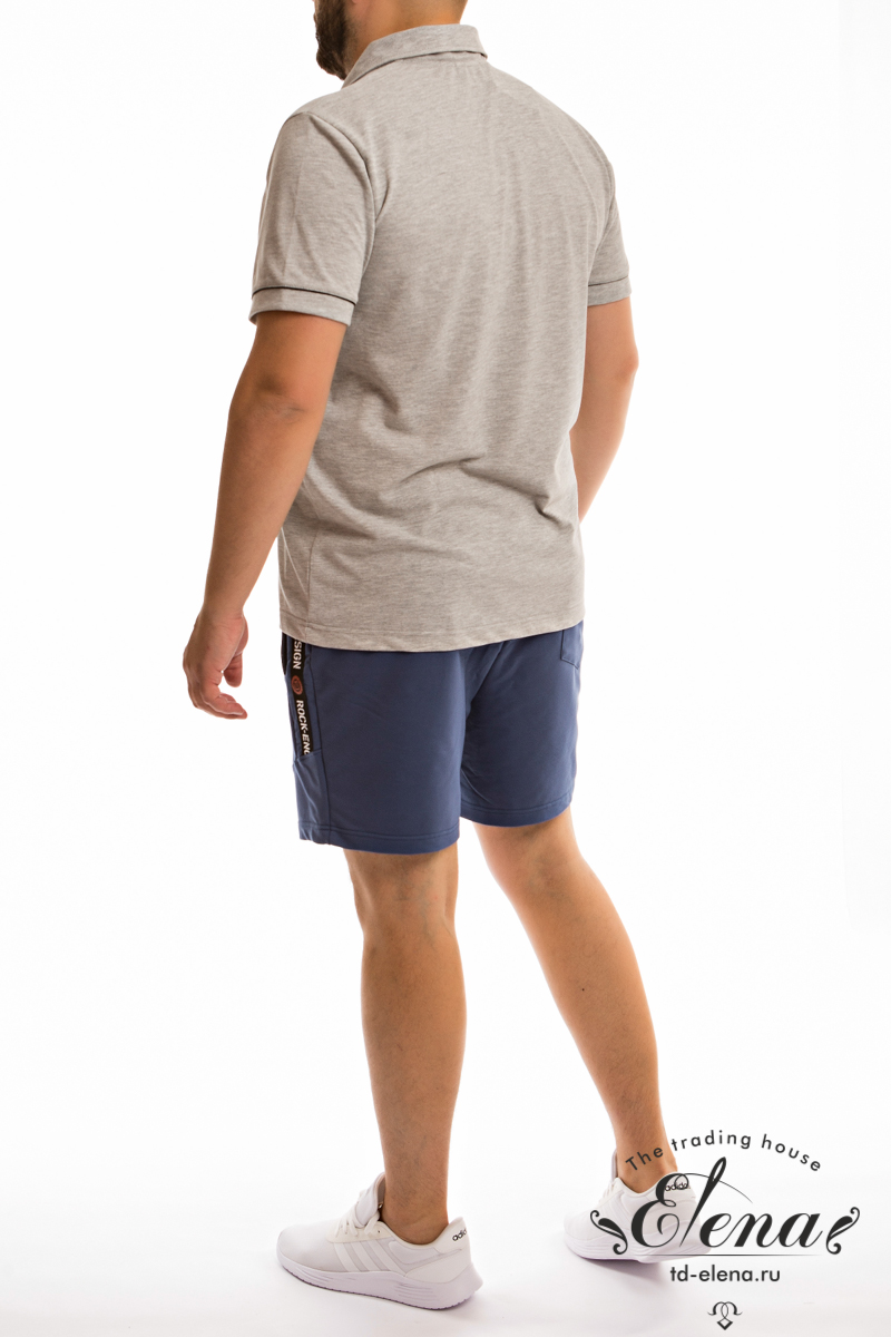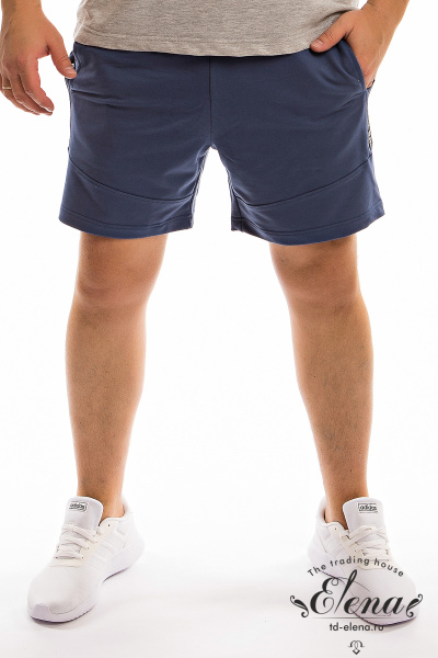 Шорты из футер петли с лайкрой, по бокам два кармана. Параллельно боковому шву, рядом с карманами настрочена отделочная резинка. Сзади расположен накладной карман. Пояс на резинке и шнуре.