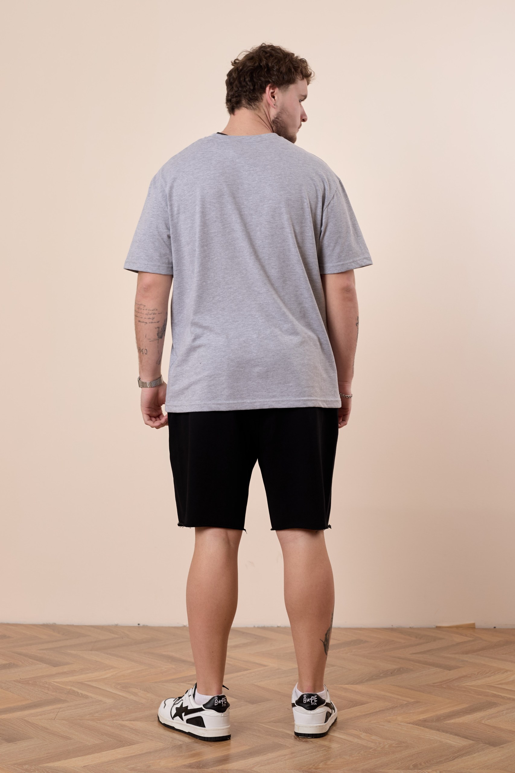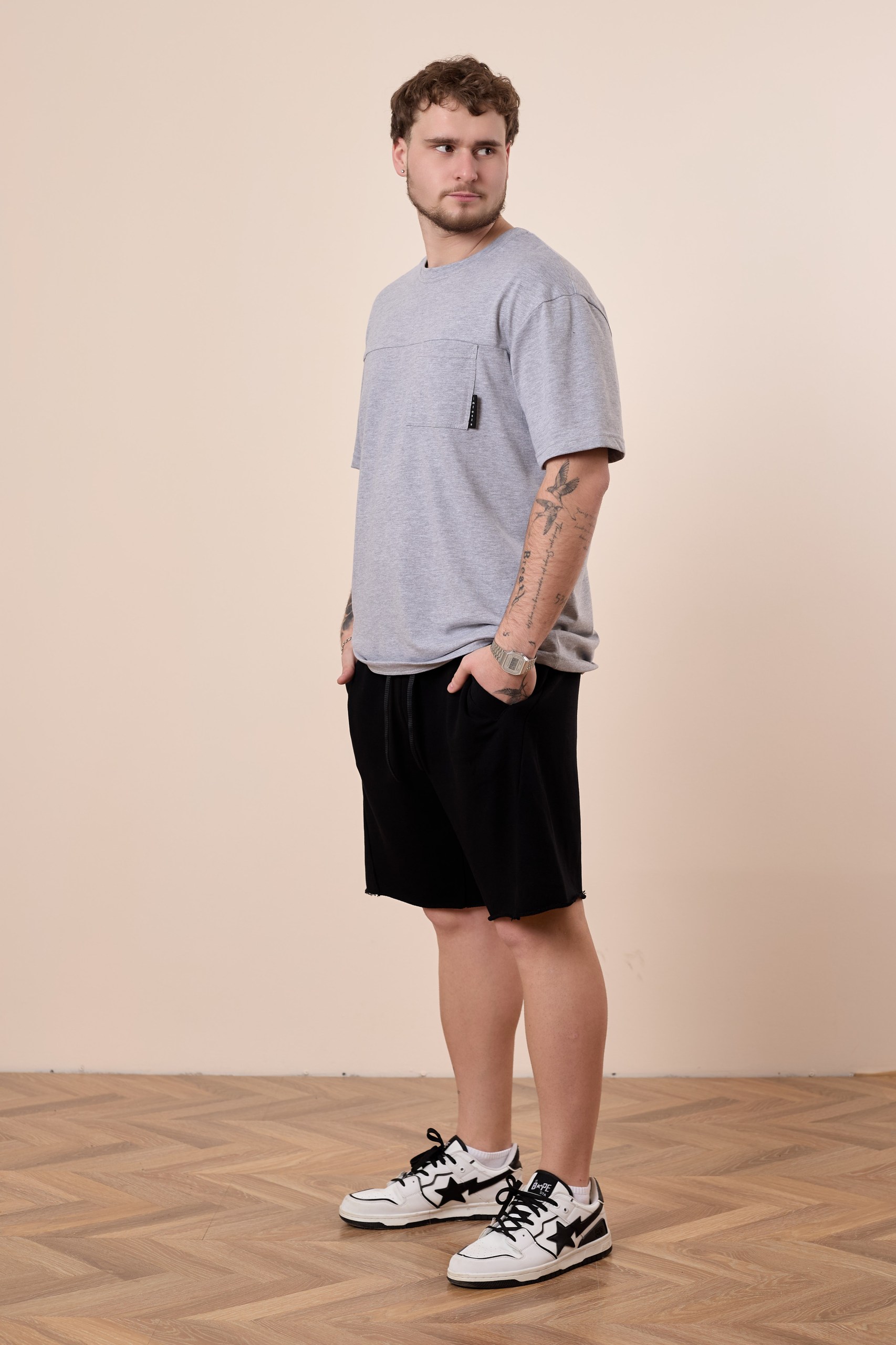 Шорты из футера 3-х нитки воздушка хлопок с притачным поясом из кашкорсе в цвет основного полотна. В пояс продернут шнур через петли. На передних половинках карманы "втачная листочка". Боковые швы сверху смещены в сторону задней половинки, а снизу - в сторону передней. Низ шорт необработанный. Длина шорт чуть выше линии колена.