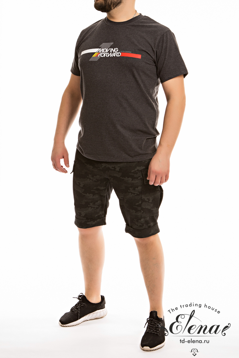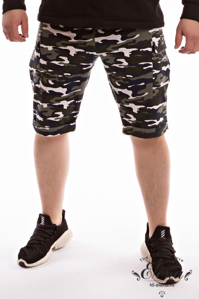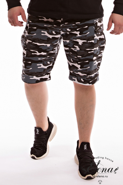 Шорты мужские выполнены из футер петли. Средней длины, низ оформлен отворотами. Сбоку, по шву, накладные карманы. В качестве отделки на боковом кармане вышивка. Пояс на резинке.