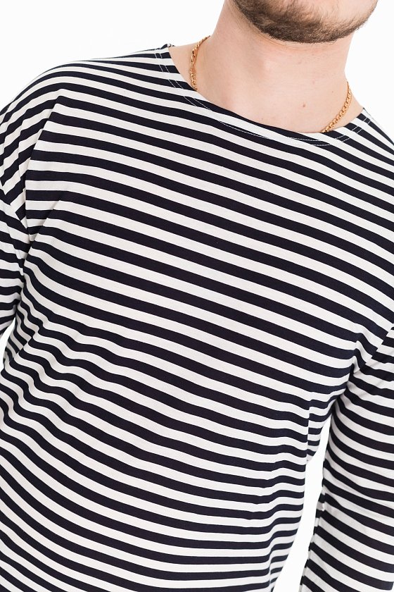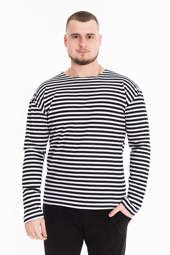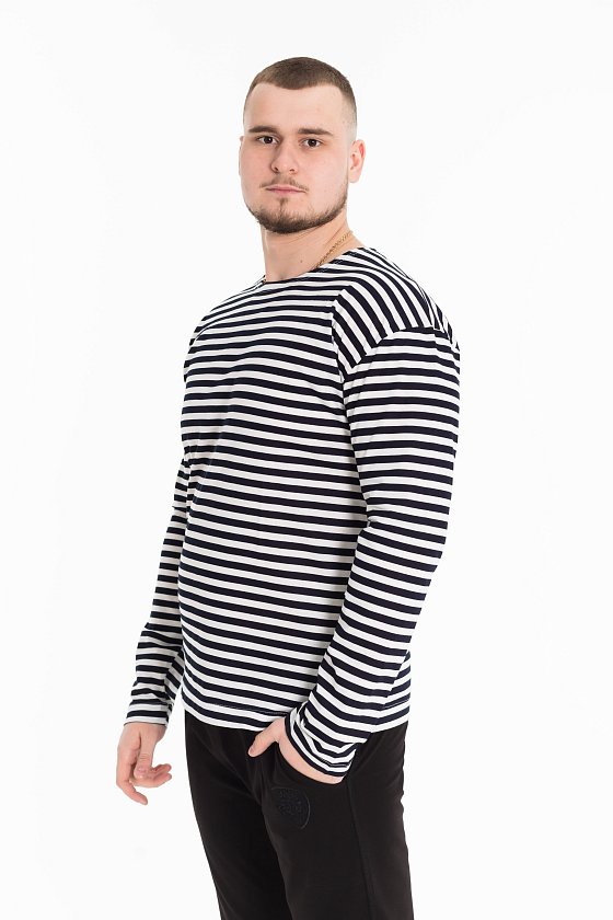 Тельняшка мужская выполнена из стопроцентного хлопка. Покрой свободный, горловина имеет круглый вырез, рукава длинные.