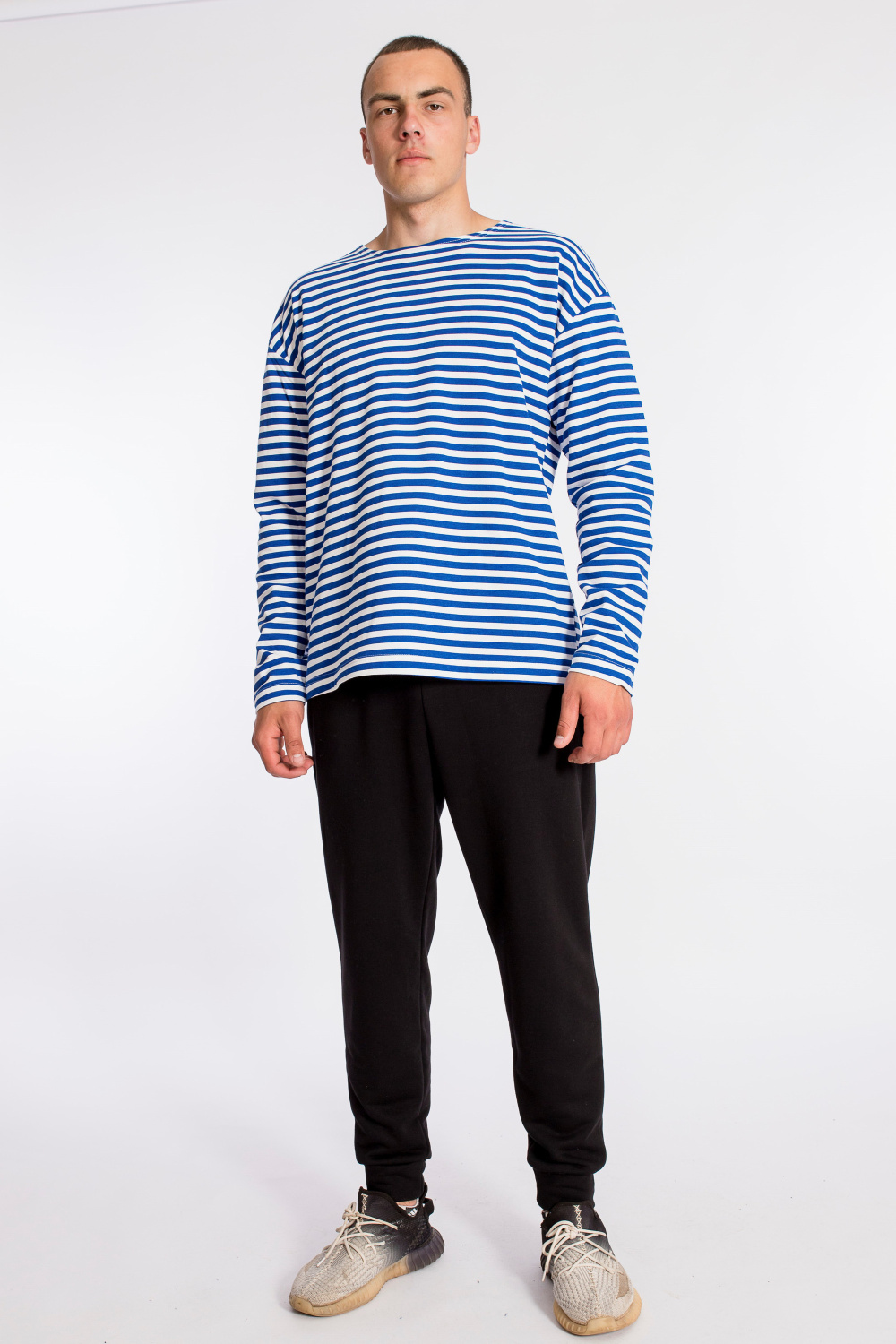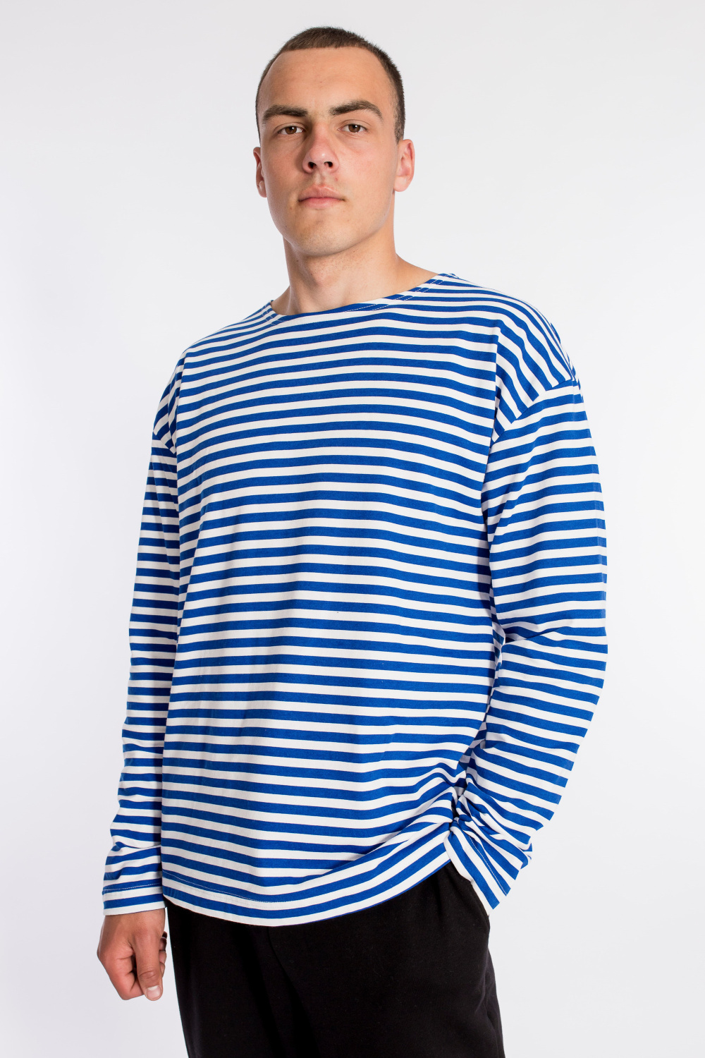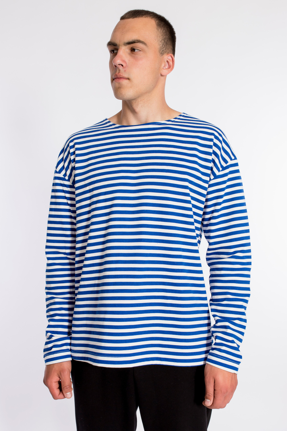Тельняшка мужская выполнена из полотна с начёсом. Покрой свободный, горловина с круглым вырезом, длинный рукав.