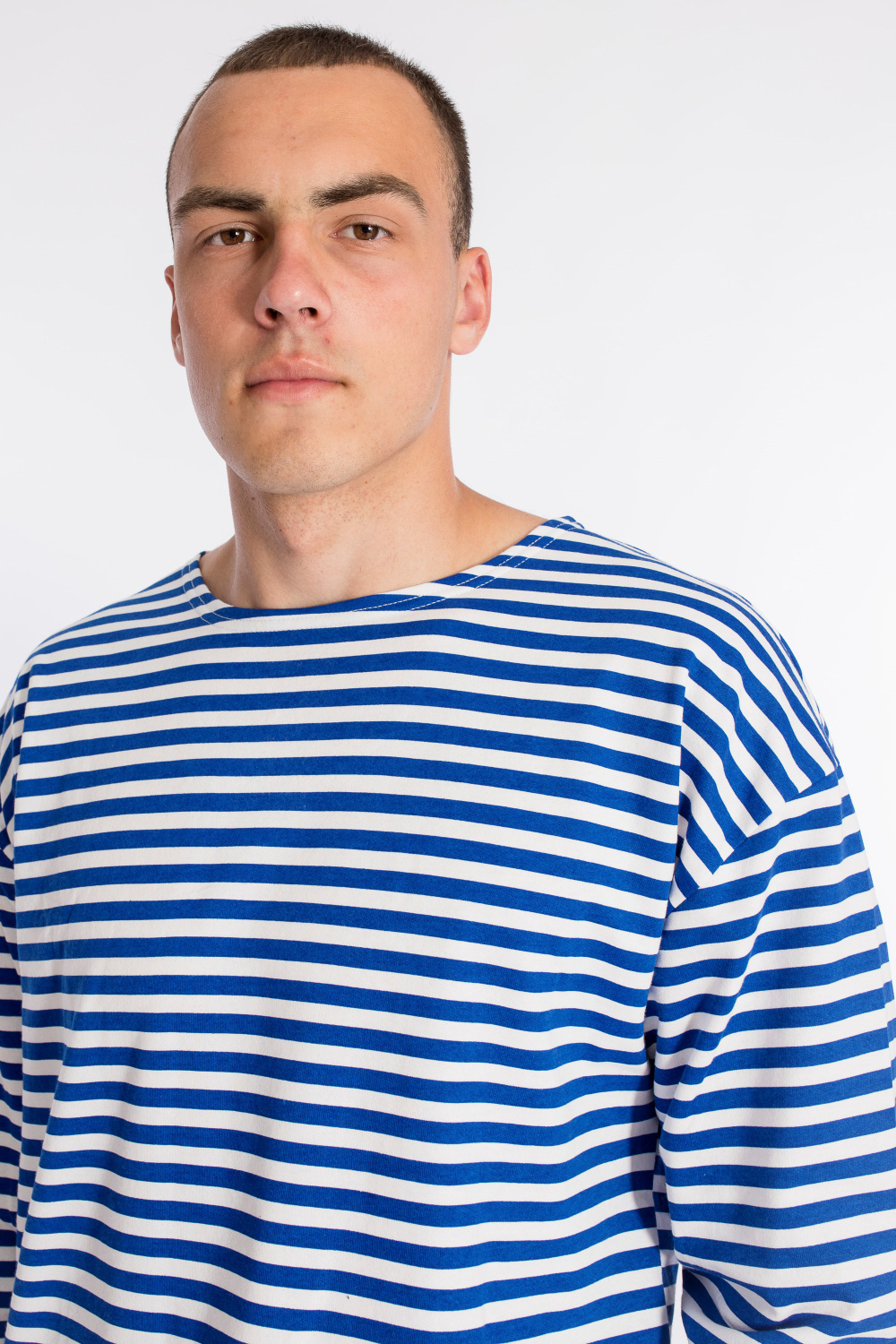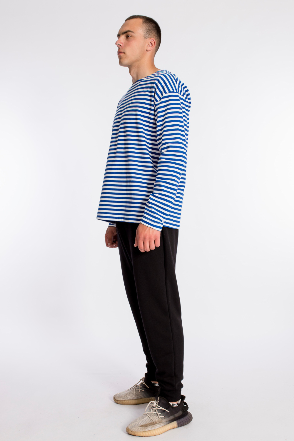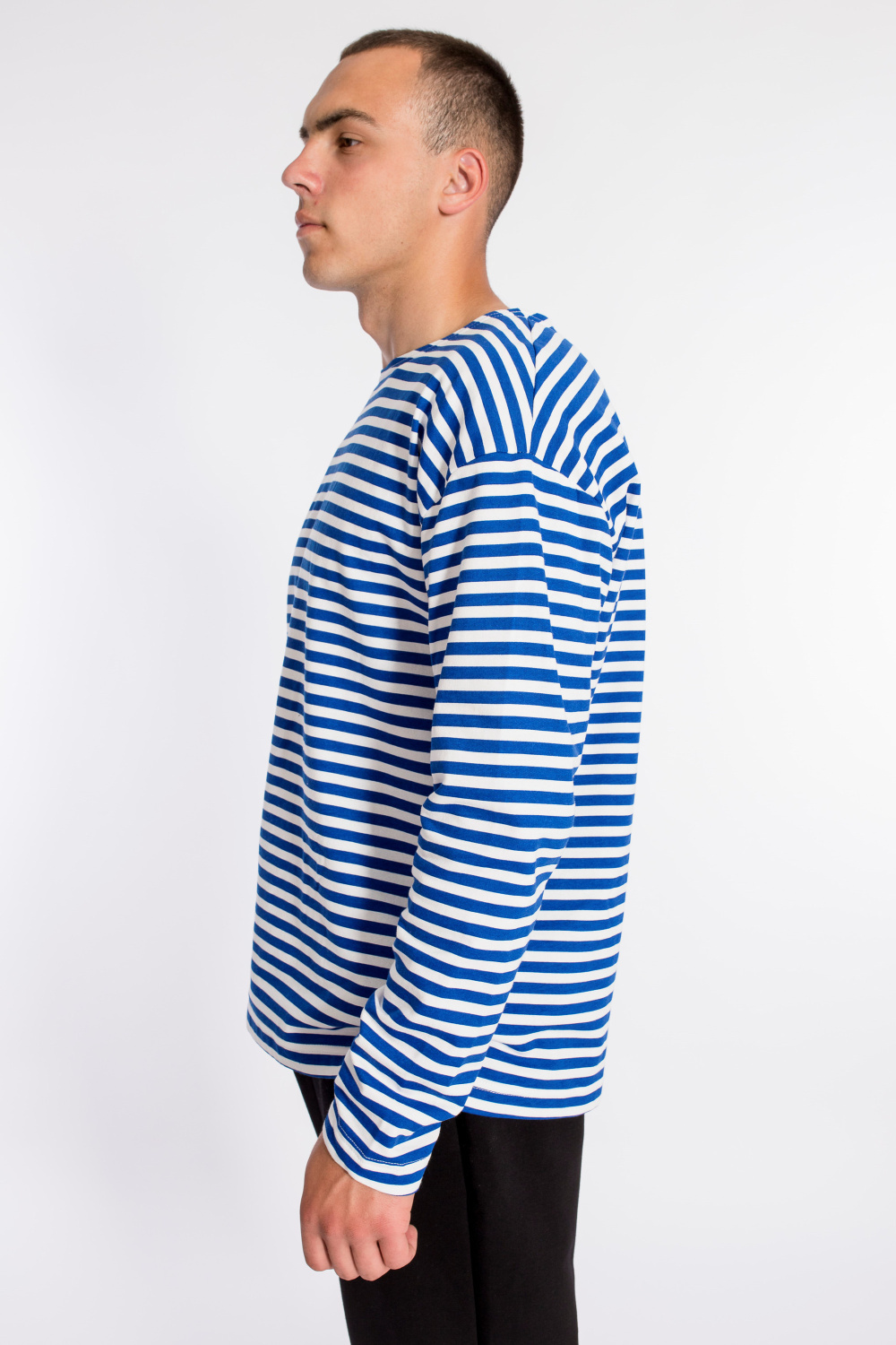 Тельняшка мужская выполнена из полотна с начёсом. Покрой свободный, горловина с круглым вырезом, длинный рукав.