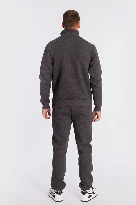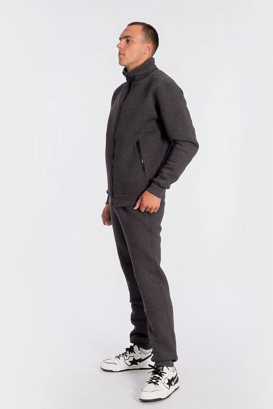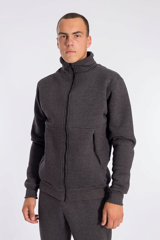 Толстовка выполнена из полотна с начёсом. Спереди застёгивается на молнию. Воротник, манжеты и пояс выполнены из кашкорсе. По бокам размещены карманы на молнии, на рукаве вышивка.