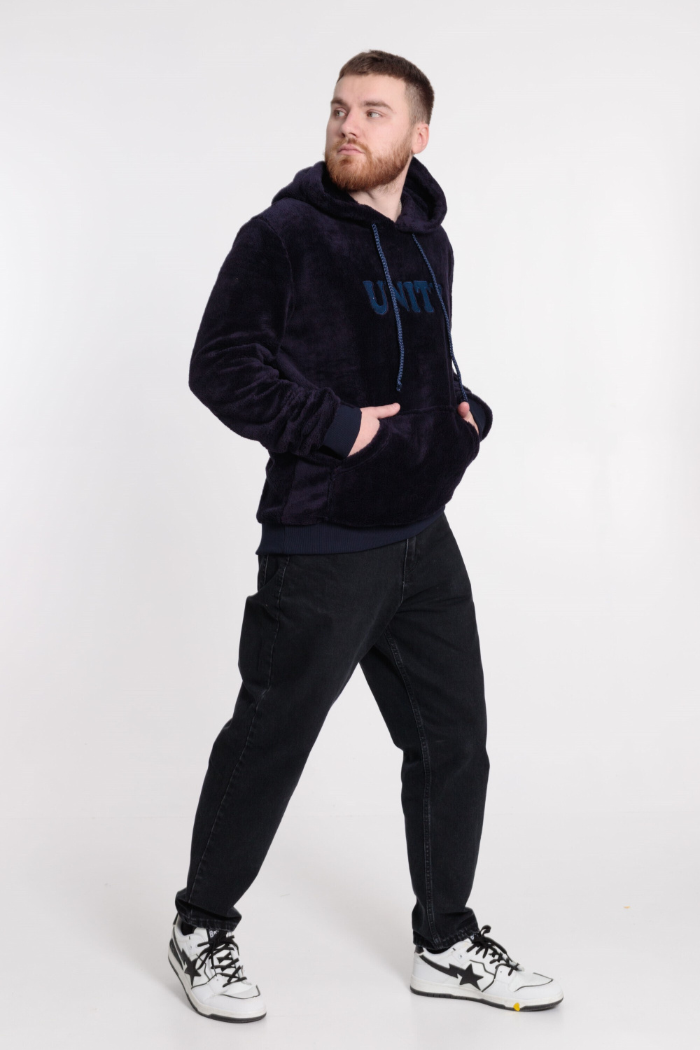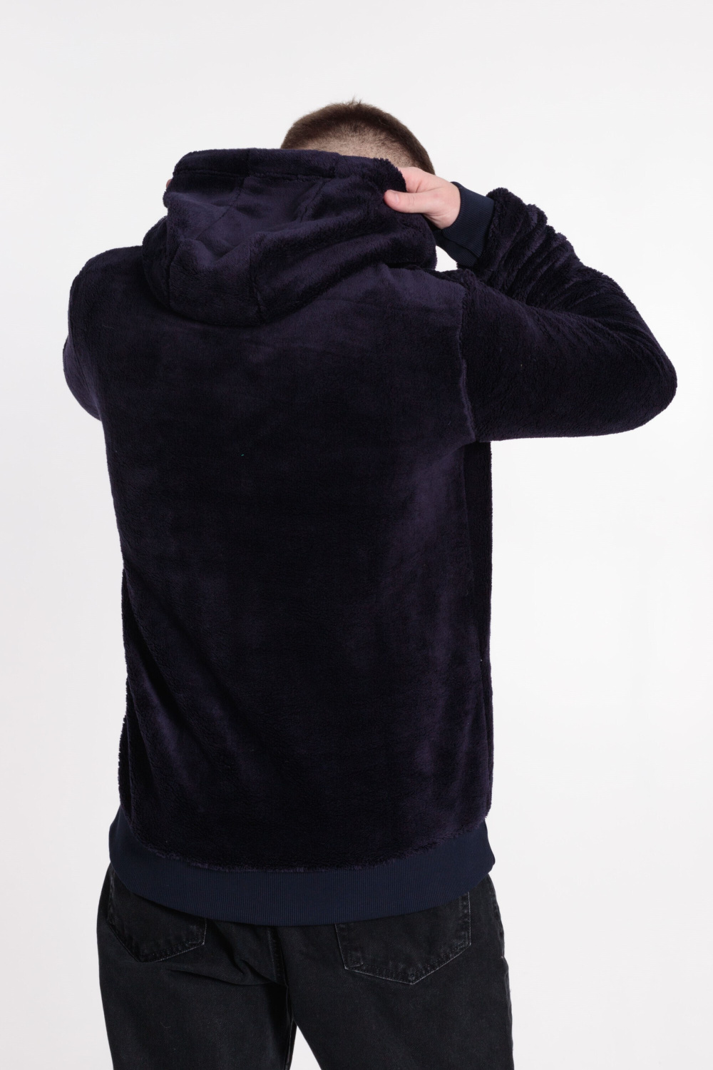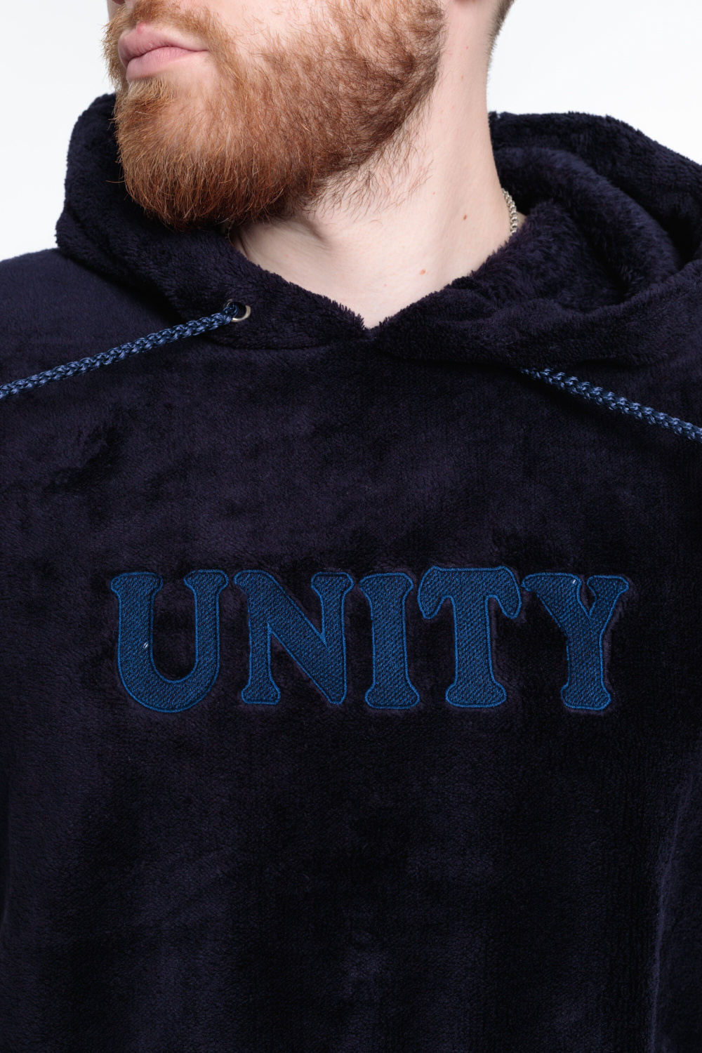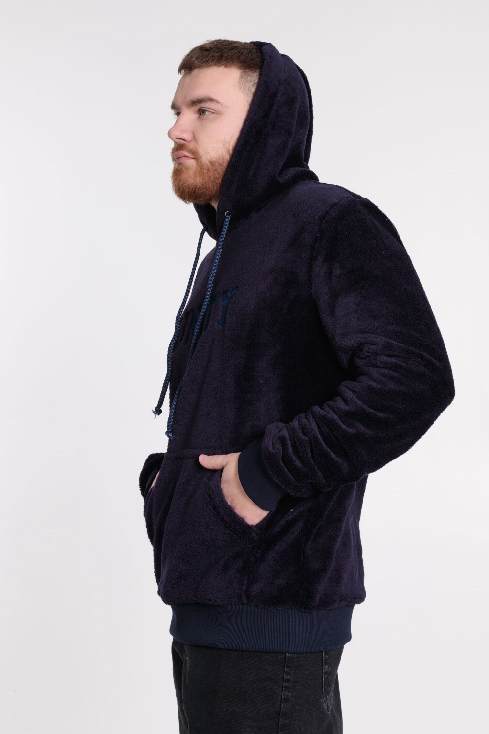Мужская толстовка из велсофта. Ширина капюшона регулируется при помощи шнура. Спереди размещены вышивка и карман, пояс и манжеты из кашкорсе.