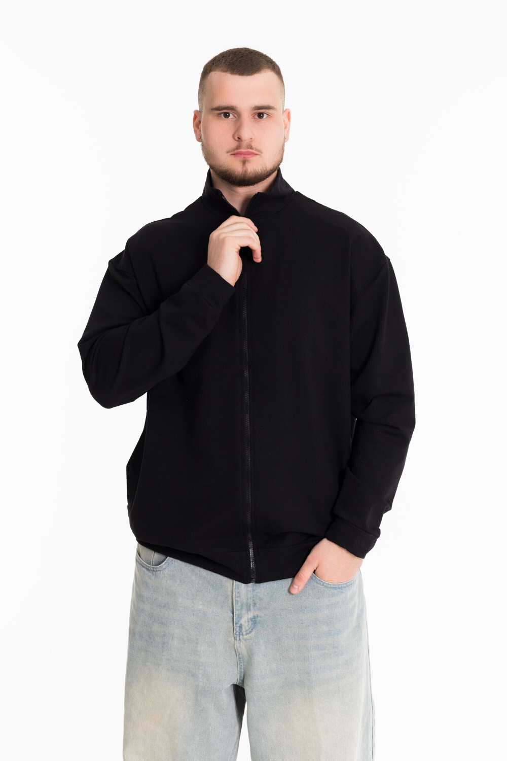 Мужская толстовка из футера в черном цвете станет уютным и стильным дополнением к вашему гардеробу. Толстовка имеет прямой крой, воротник-стоечку и центральную застежку на молнию.  Длинные рукава и карманы делают эту толстовку удобной и практичной для повседневной носки. Изготовленная из качественного футера, она обеспечивает тепло и комфорт в прохладные дни. Черный цвет легко сочетается с другой одеждой, делая эту толстовку универсальной и легкой в сочетании. Такая толстовка идеально подойдет для прогулок, спортивных занятий или просто для отдыха.