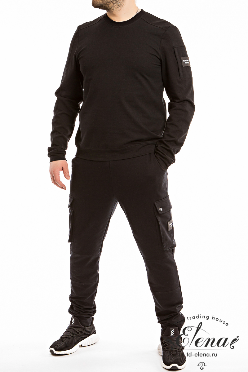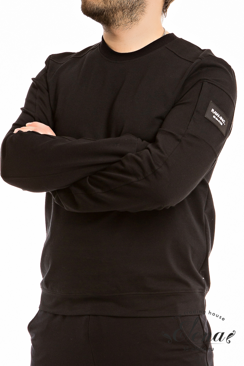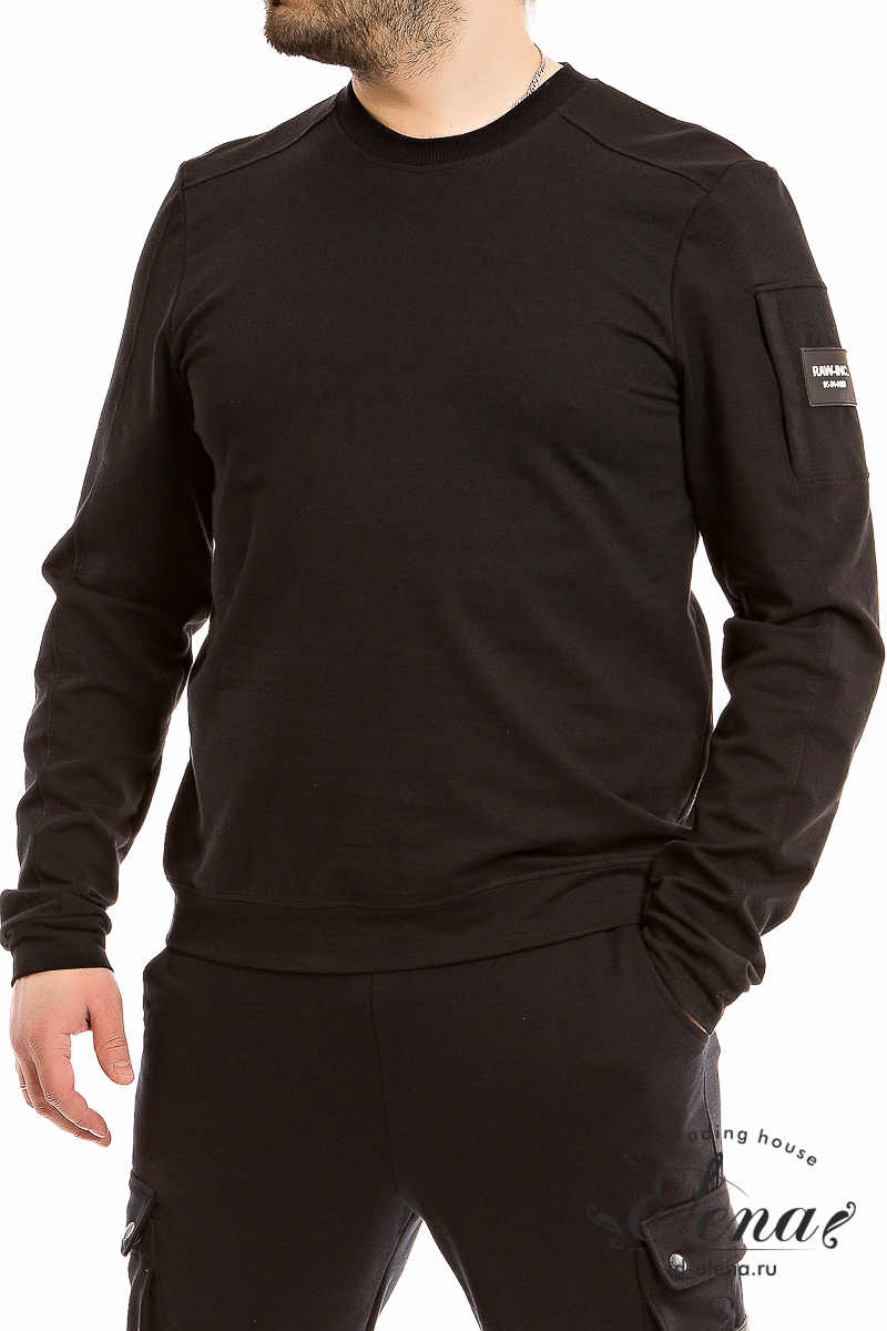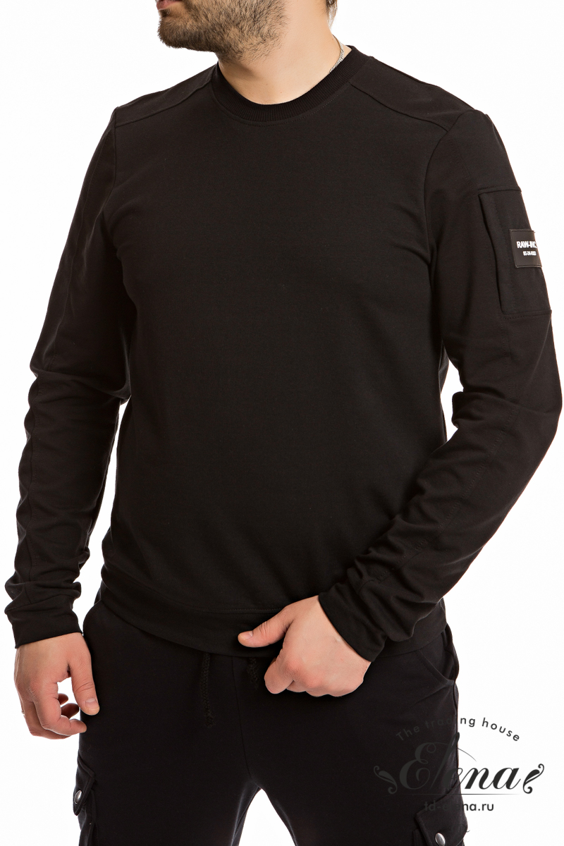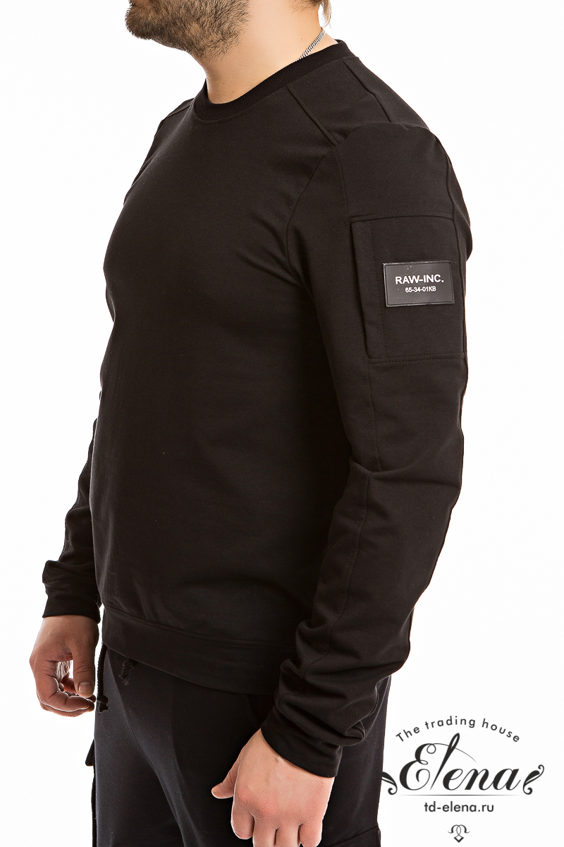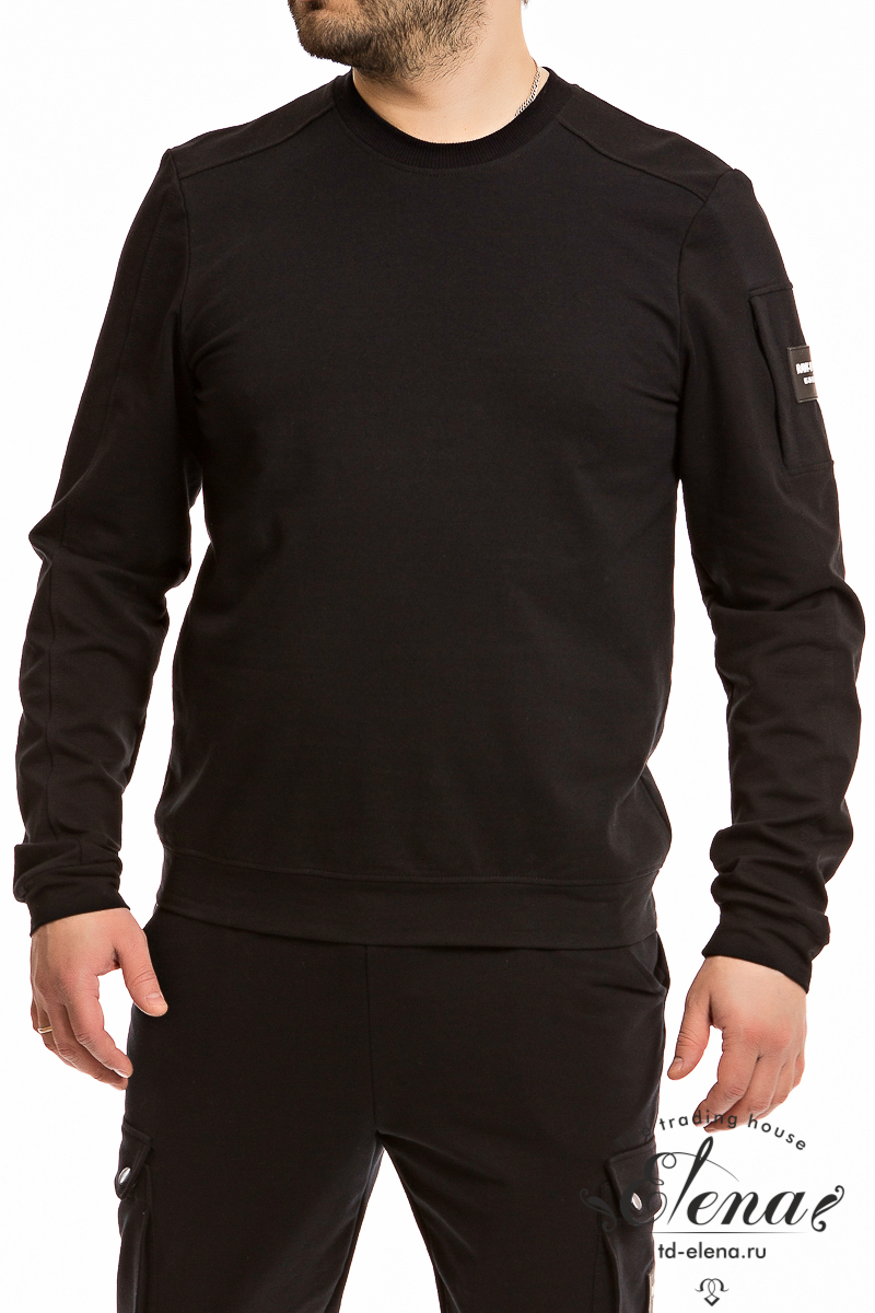 Толстовка из футер петли с лайкрой черного цвета. Рукав длинный, на манжете. Горловины круглая с планкой из кашкорсе. На левом рукаве карман на молнии с декоративной нашивкой.