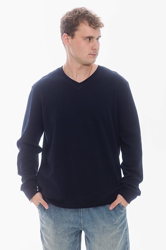 Мужской классический джемпер выполнен из однотонного полотна "силаник". Модель с V-образным вырезом горловины, длинными втачными рукавами с притачными манжетами и притачным поясом. Лаконичный дизайн делает джемпер универсальным вариантом для повседневных и деловых образов.