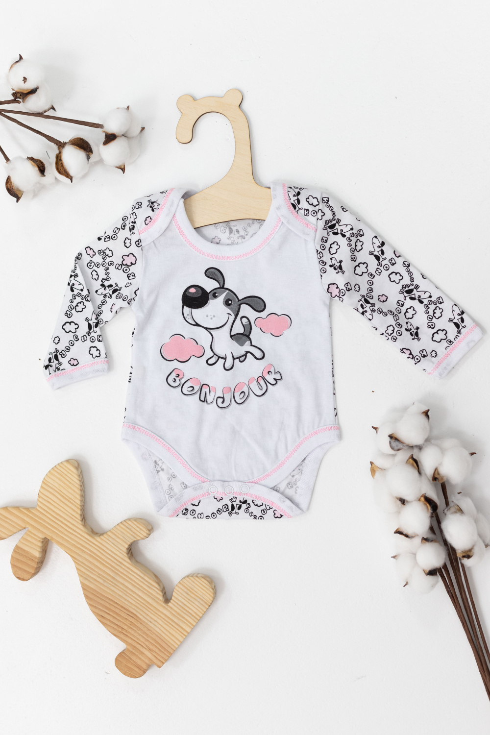 Боди из хлопкового полотна. С длинным рукавом, внизу застёжка на кнопки. Спереди нанесён принт.