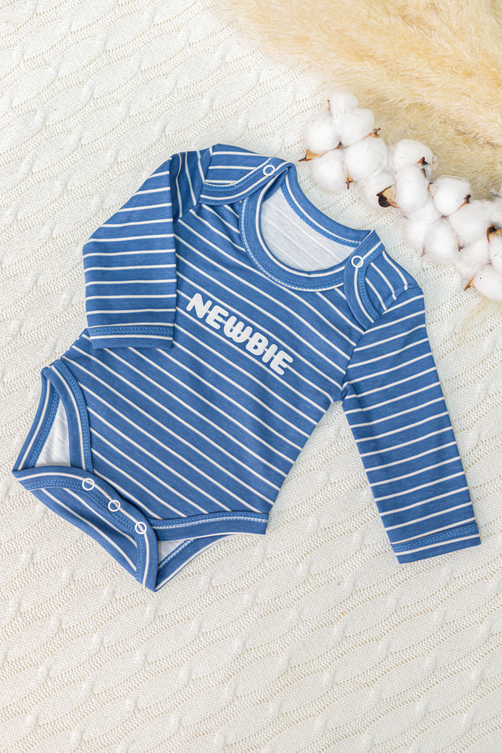 Боди для новорожденных из интерлока цвета индиго в полоску. Длинные рукава подойдут для теплоты и защиты в прохладные дни. За счет застежек-кнопок в нижней части и на пересечении горловины, переодевание малыша будет удобным. Бейка в цвет основного полотна на горловине, рукавах и по низу придает изделию завершенный вид. Спереди нанесен принт, который добавит изюминку и индивидуальность образу.