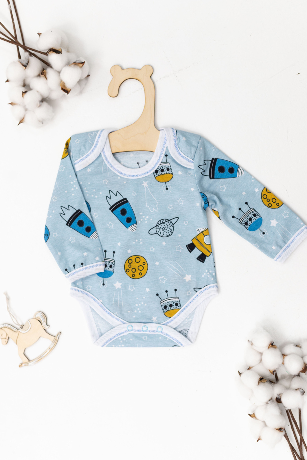 Боди для грудничков выполнены из 100% хлопковой ткани. С длинным рукавом и застёжкой на кнопки снизу. Боди очень удобны в повседневной носке и обеспечивают комфорт вашему ребенку.