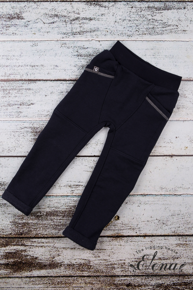 Брюки выполнены из футера-воздушки. С карманами, отложными манжетами и притачным поясом на резине из кашкорсе. Сбоку размещена декоративная нашивка.