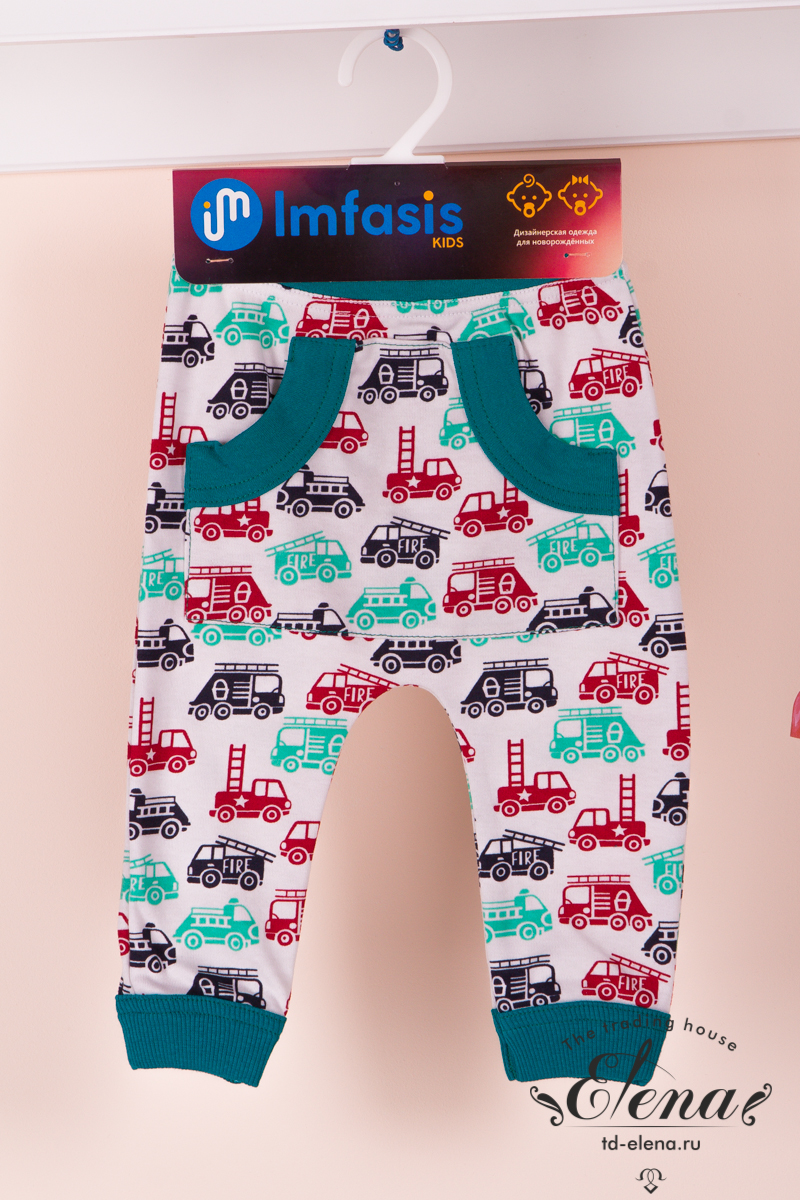 Брючки для самых маленьких пошиты из 100% хлопковой ткани различных расцветок, с карманом «кенгуру» спереди, с резиной по поясу и спец отделкой по низу.