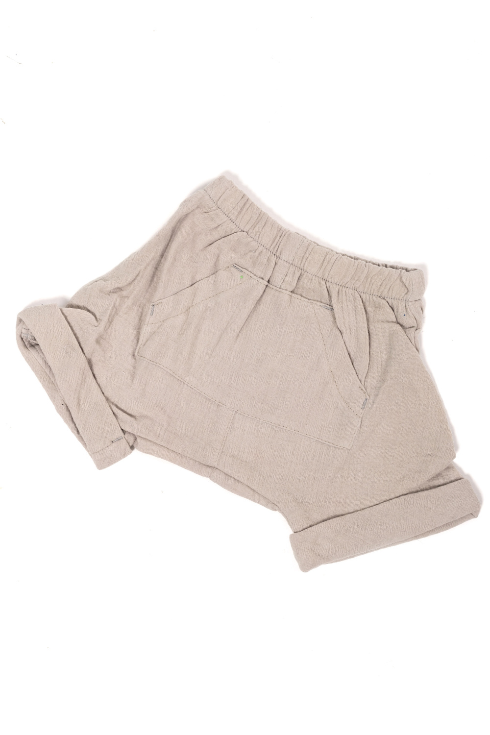 Шорты выполнены из муслиновой ткани. Покрой свободный, под памперс.