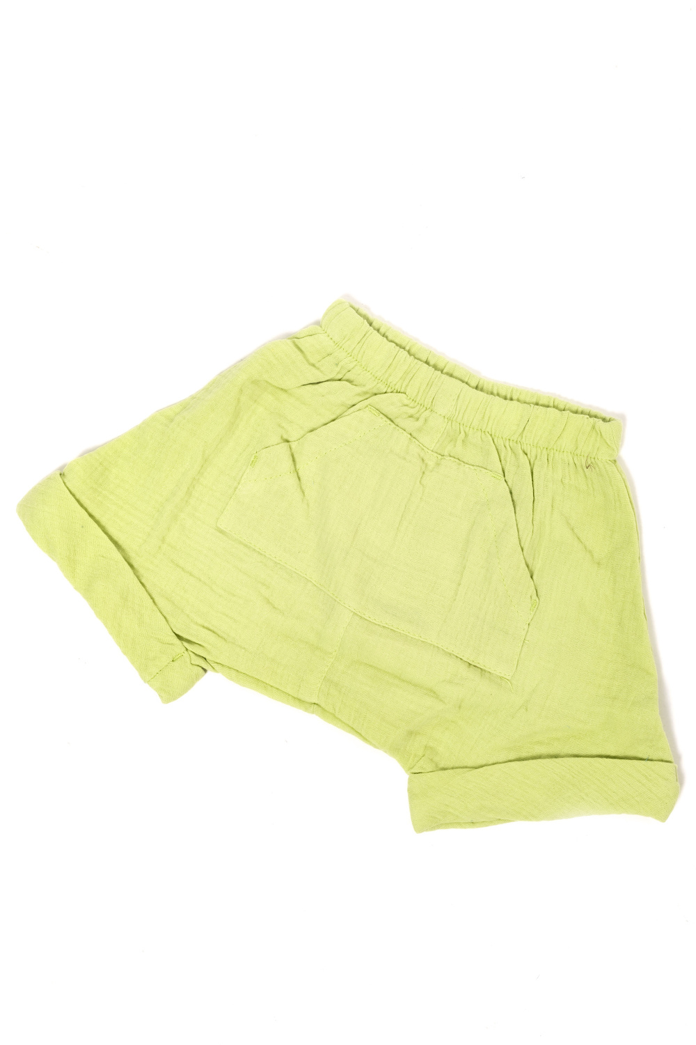 Шорты выполнены из муслиновой ткани. Покрой свободный, под памперс.