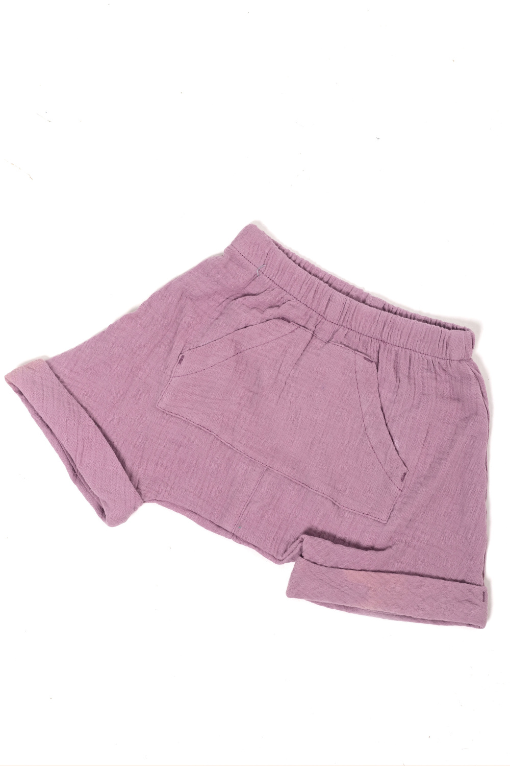 Шорты выполнены из муслиновой ткани. Покрой свободный, под памперс.