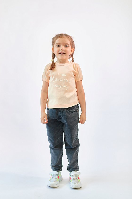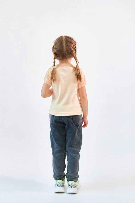 Детская футболка из однотонного ластика. Короткий рукав, круглый вырез горловины с застёжкой на кнопки. Спереди расположен принт.