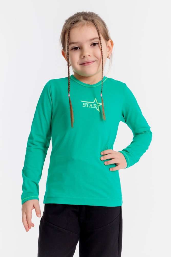 Футболка из однотонной кулирки с лайкрой с длинным втачным рукавом. С застежкой на плече на кнопки, спереди нанесён термопринт.