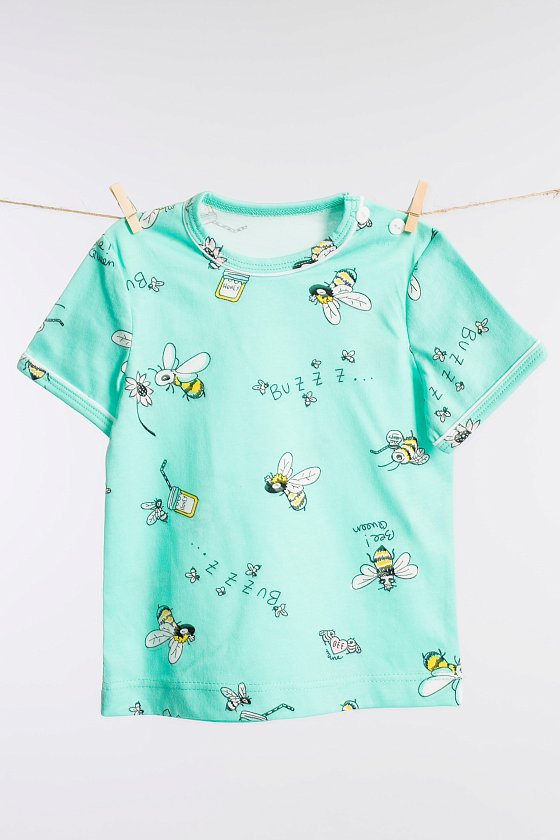 Футболка из кулирки, 100% хлопок. С коротким рукавом. На левом плече застежка на пуговицы. Горловина и низ рукавов обработаны бейкой с кантом.