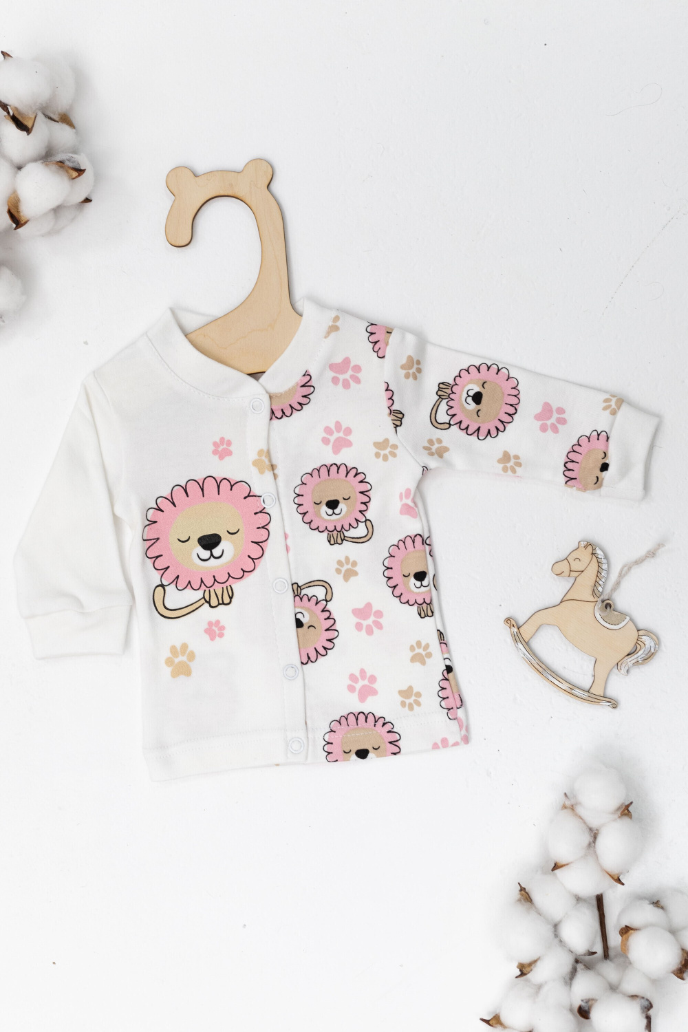 Кофточка выполнена из интерлока. С длинным рукавом, застёжкой на кнопки спереди и принтом.