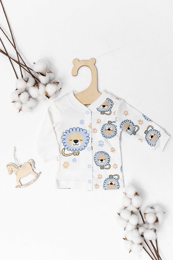 Кофточка выполнена из интерлока. С длинным рукавом, застёжкой на кнопки спереди и принтом.